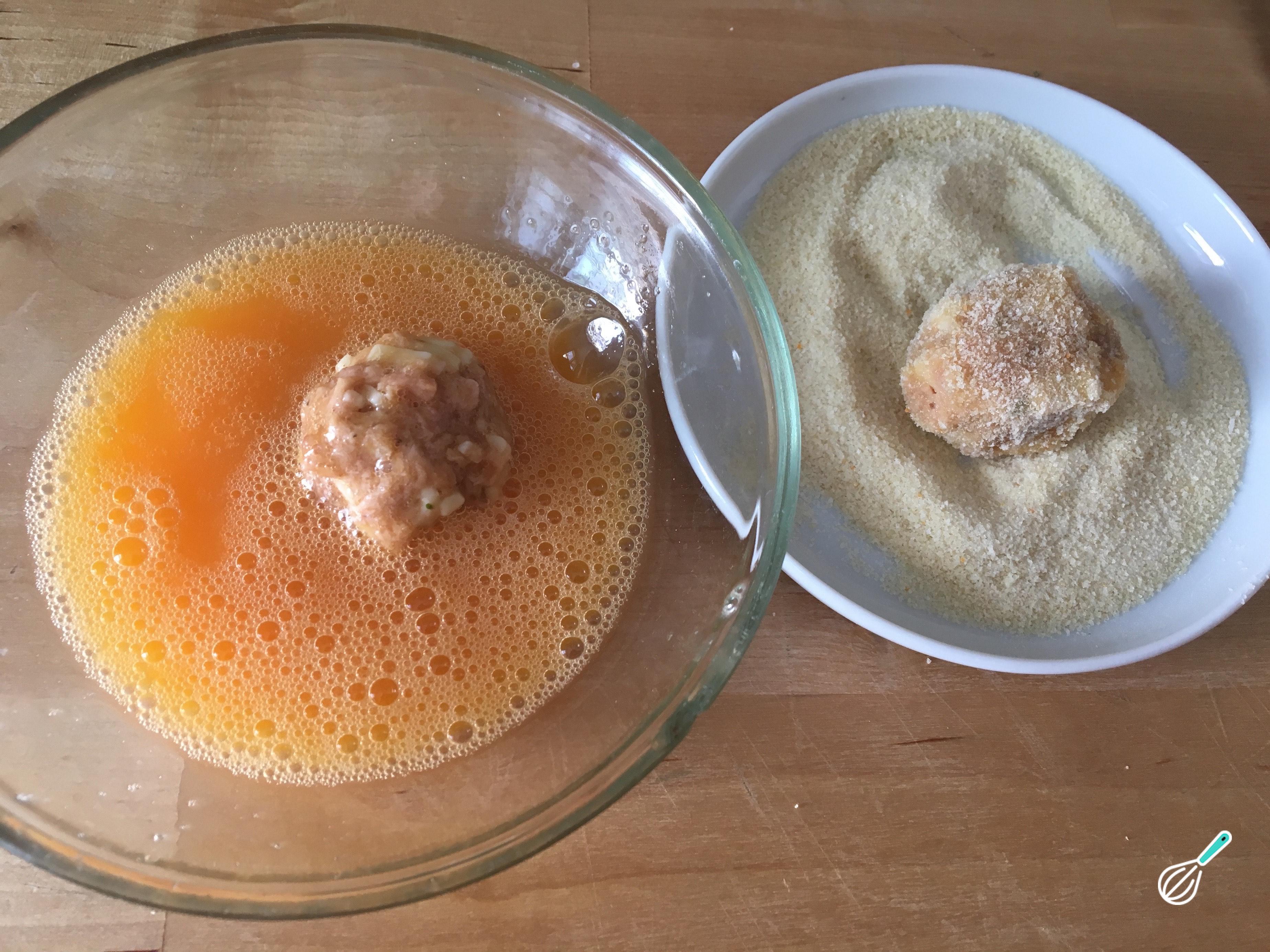 Passe o bolinho de atum por ovo batido e de seguida por farinha de rosca, até acabar com todos os bolinhos.