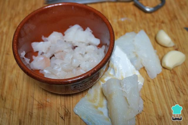 Para começar essa deliciosa receita de bolinho de bacalhau desfie o bacalhau ainda cru, retire a espinha e a pele. Em seguida, descasque e pique os dentes de alho.