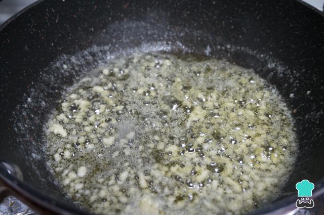 Aqueça uma panela, em fogo médio, com a manteiga. Quando a manteiga derreter, coloque os alhos picados e refogue.