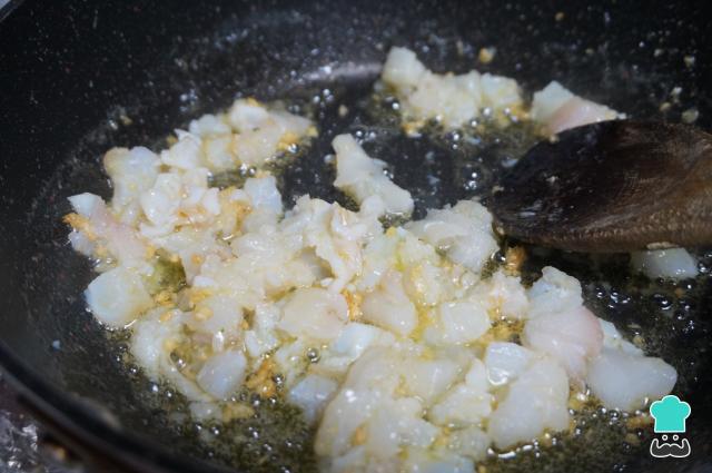 Antes do alho ficar dourado, adicione o bacalhau cru e mexa para que todos os ingredientes fiquem bem misturados.