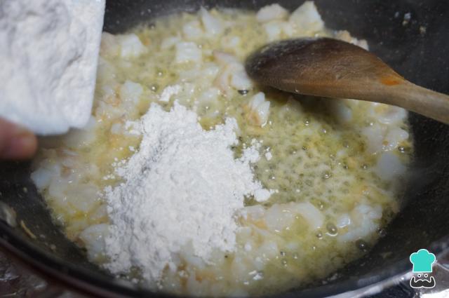 Coloque também a farinha, misture e deixe cozinhar por 3 minutos.