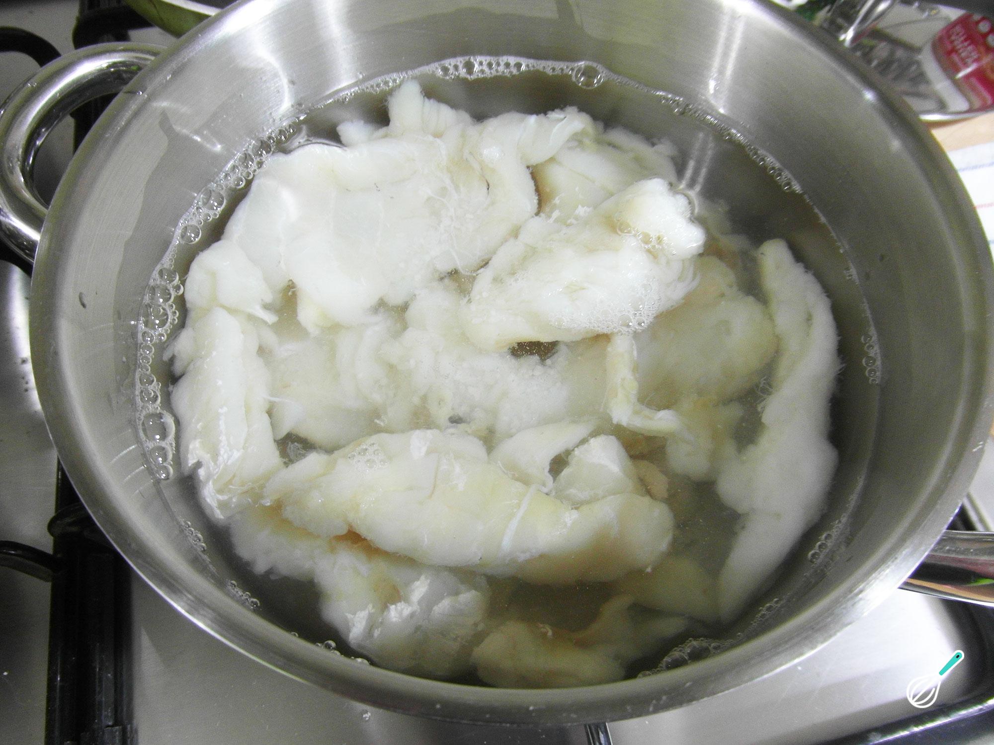 Noutra panela com um água e um pouco de sal cozinhe o bacalhau durante 10 minutos. Após esse tempo desligue, escorra a água, deixe esfriar um pouco e desfie sem a pele nem espinhas.