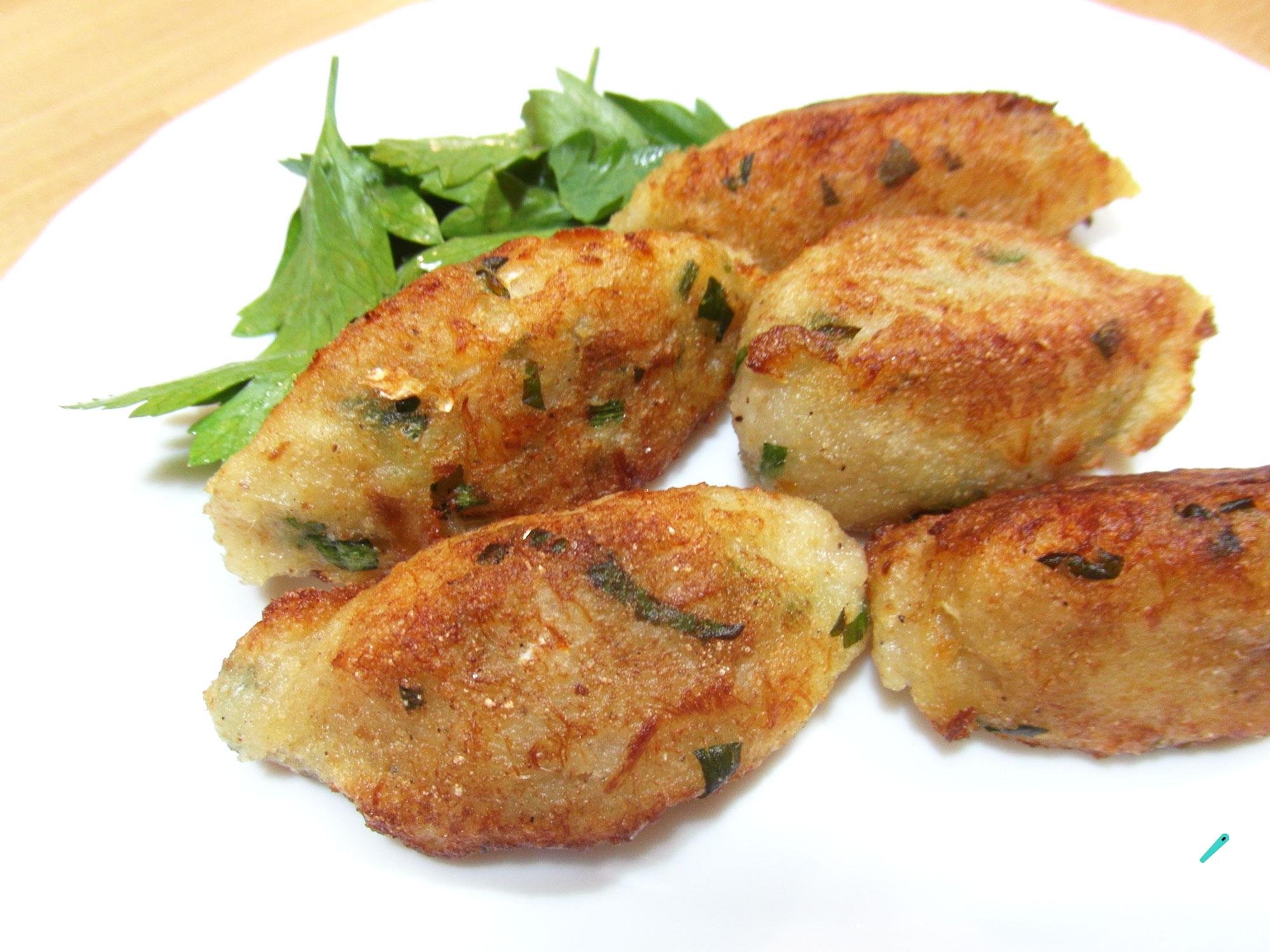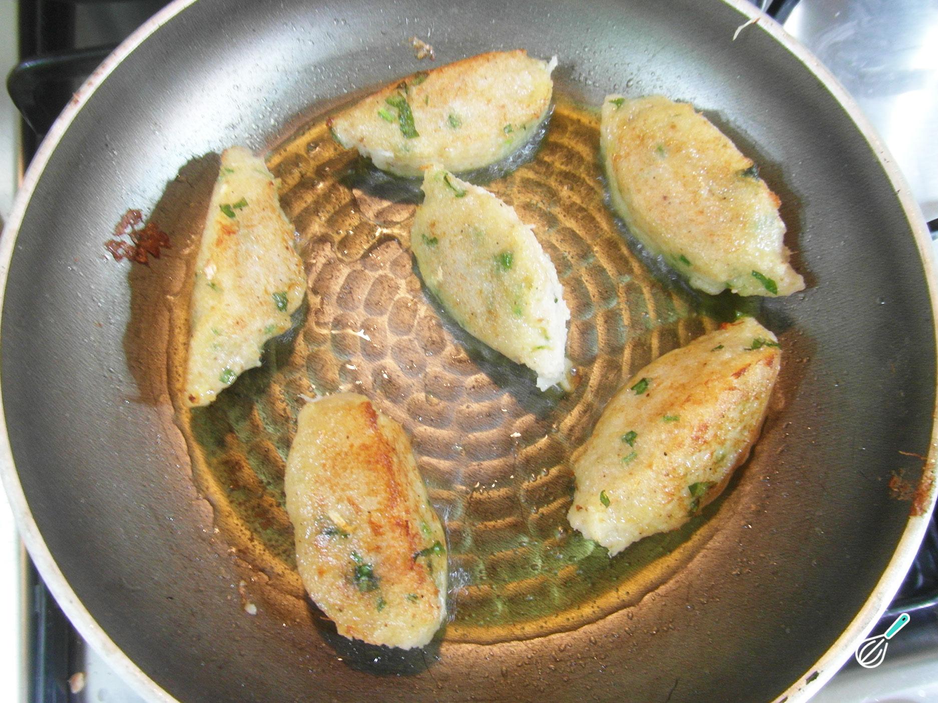 Finalmente leve ao fogo uma frigideira com azeite suficiente para cobrir o fundo. Com a mão ou com a ajuda de duas colheres modele os bolinhos e frite no azeite até ficarem dourados de todos os lados.