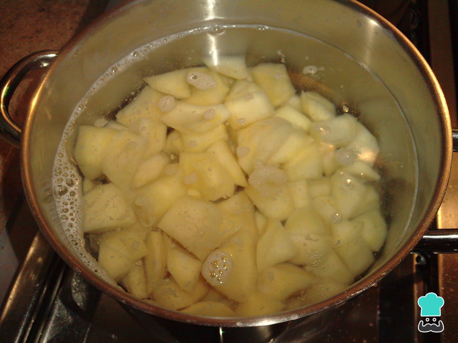 Para preparar o bolinho de bacalhau tradicional, a primeira coisa a fazer é descascar a batata, cortá-la em cubos e cozinhar numa panela com água e um pouco de sal, em fogo médio. Quando estiver quase desfazendo, adicione o bacalhau e cozinhe por mais 10-15 minutos.
