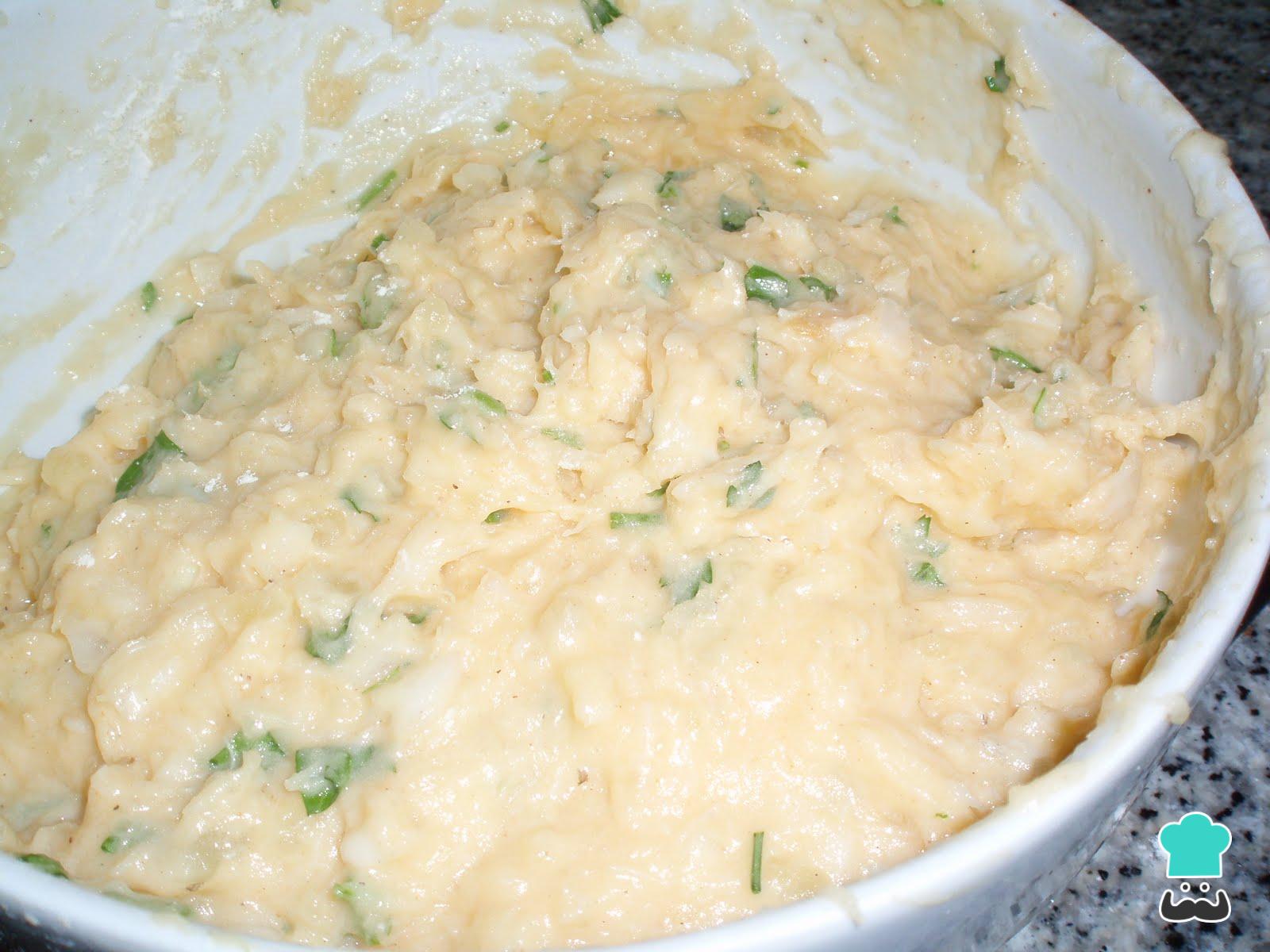 Retire as batatas e o bacalhau e reserve o caldo. Desfie o bacalhau o mais fino possível e rejeite as espinhas, caso haja. Amasse as batatas para obter purê e misture nelas o peixe.