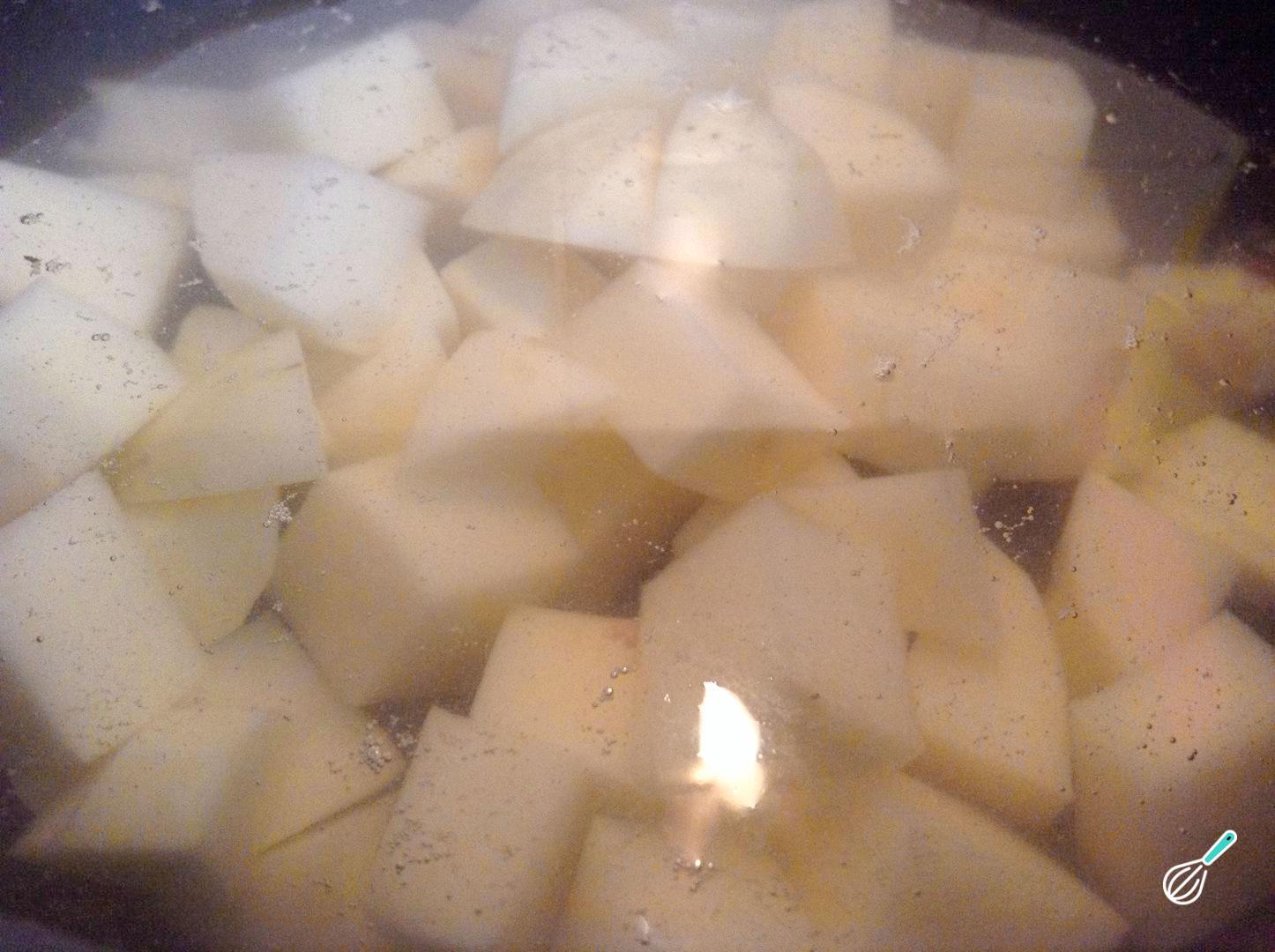 Descasque e corte as batatas em cubos médios. Cozinhe-as numa panela no fogo médio, cobertas com água e com uma pitada de sal, até que fiquem macias (10 a 20 minutos depois de ferver). Escorra, coloque numa tigela e amasse as batatas com um garfo, até obter um purê rústico. Reserve para esfriar.