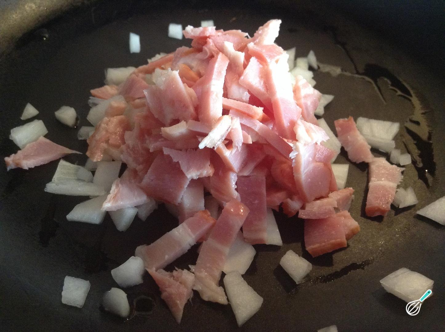 Em seguida, pique a cebola e o bacon e leve para dourar numa frigideira no fogo médio com um fio de óleo, azeite ou um pouco de banha de porco caseira. Mexa de vez em quando, para não deixar queimar, e reserve.