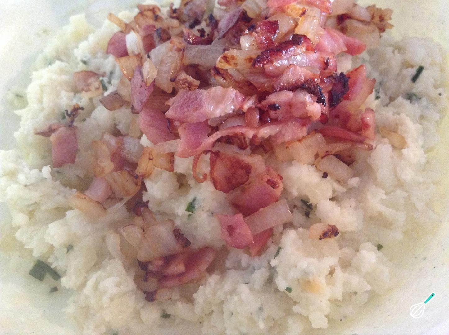 Misture no purê de batatas o queijo picado ou ralado, o requeijão cremoso ou queijo creme, alguma erva aromática da sua preferência e acerte o sabor com sal e pimenta. Adicione a cebola e o bacon quando dourarem e misture tudo muito bem.