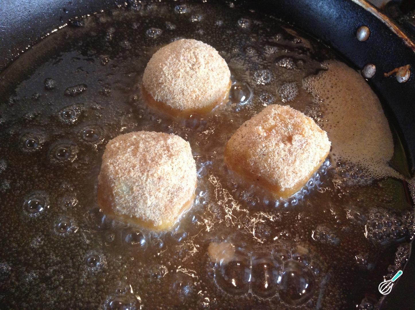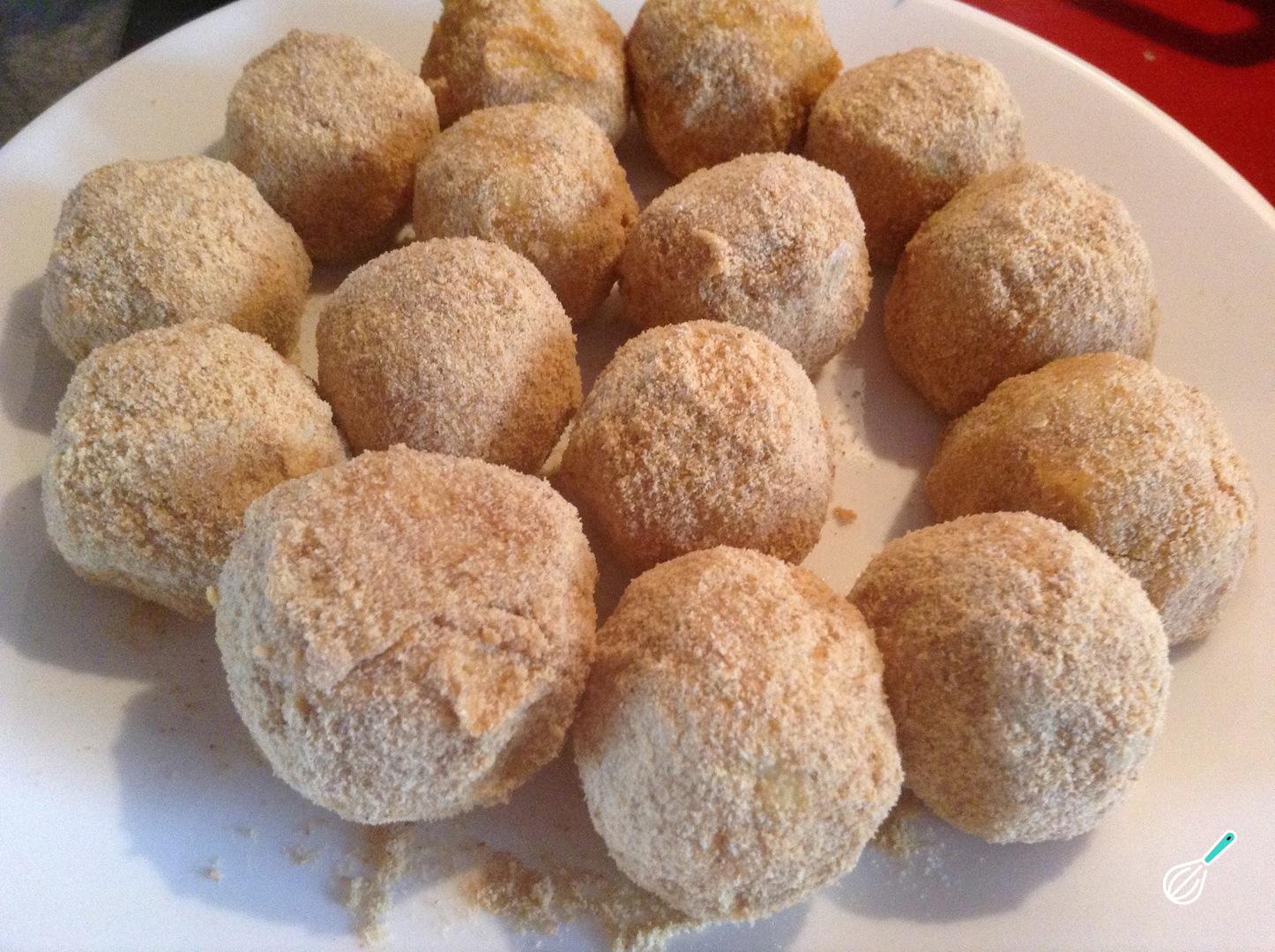 Modele os bolinhos e reserve-os na geladeira por 30 minutos, para que fiquem mais firmes. Depois bata o ovo numa tigela e coloque a farinha de trigo e a farinha de rosca em recipientes separados. Envolva os bolinhos na farinha de trigo, depois no ovo e, por fim, na farinha de rosca, para empanar completamente.