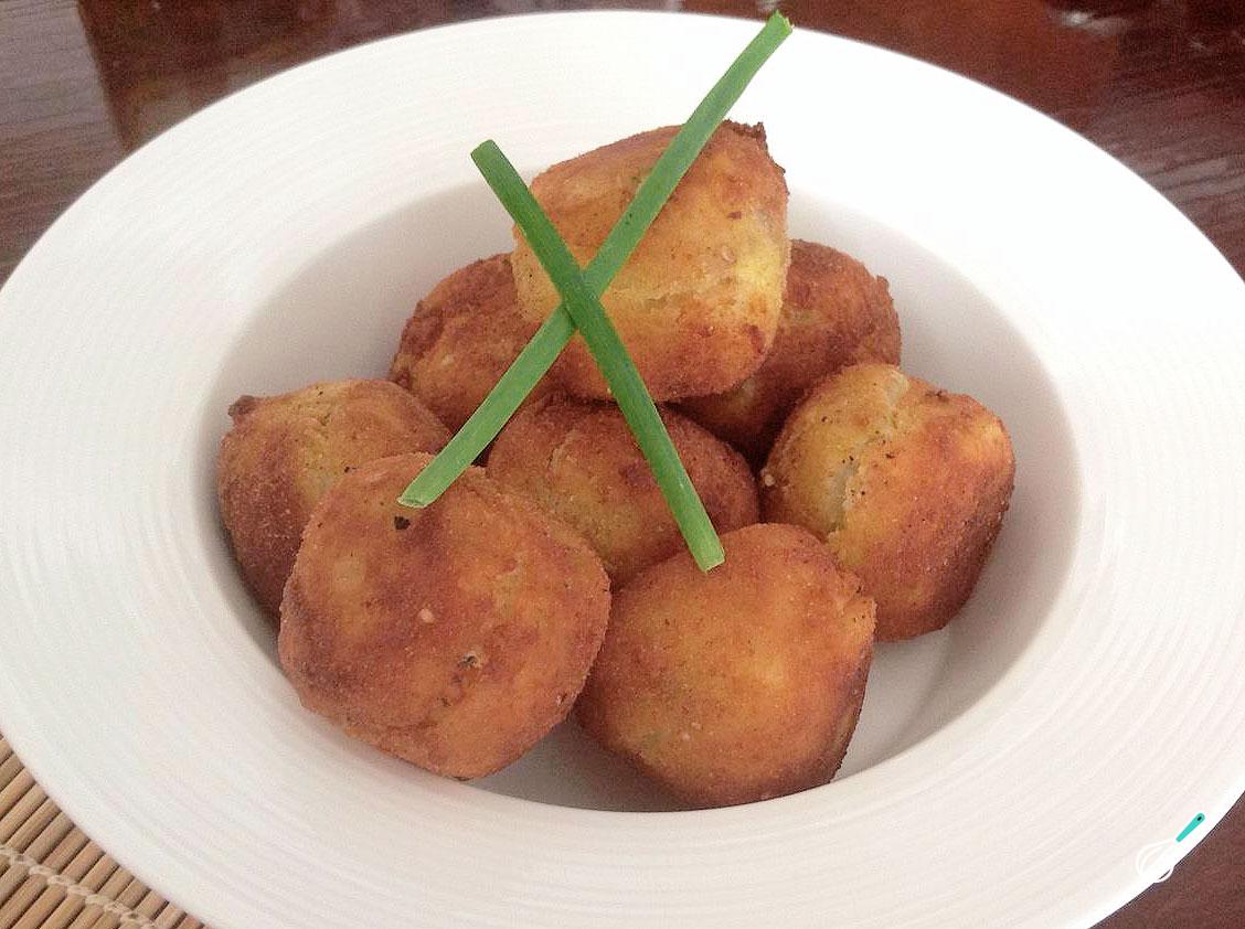 Está pronto seu bolinho de batata frito com queijo e bacon! Sirva enquanto quente acompanhando com um molho pronto da sua preferência ou com molho barbecue caseiro, por exemplo. Bom apetite!