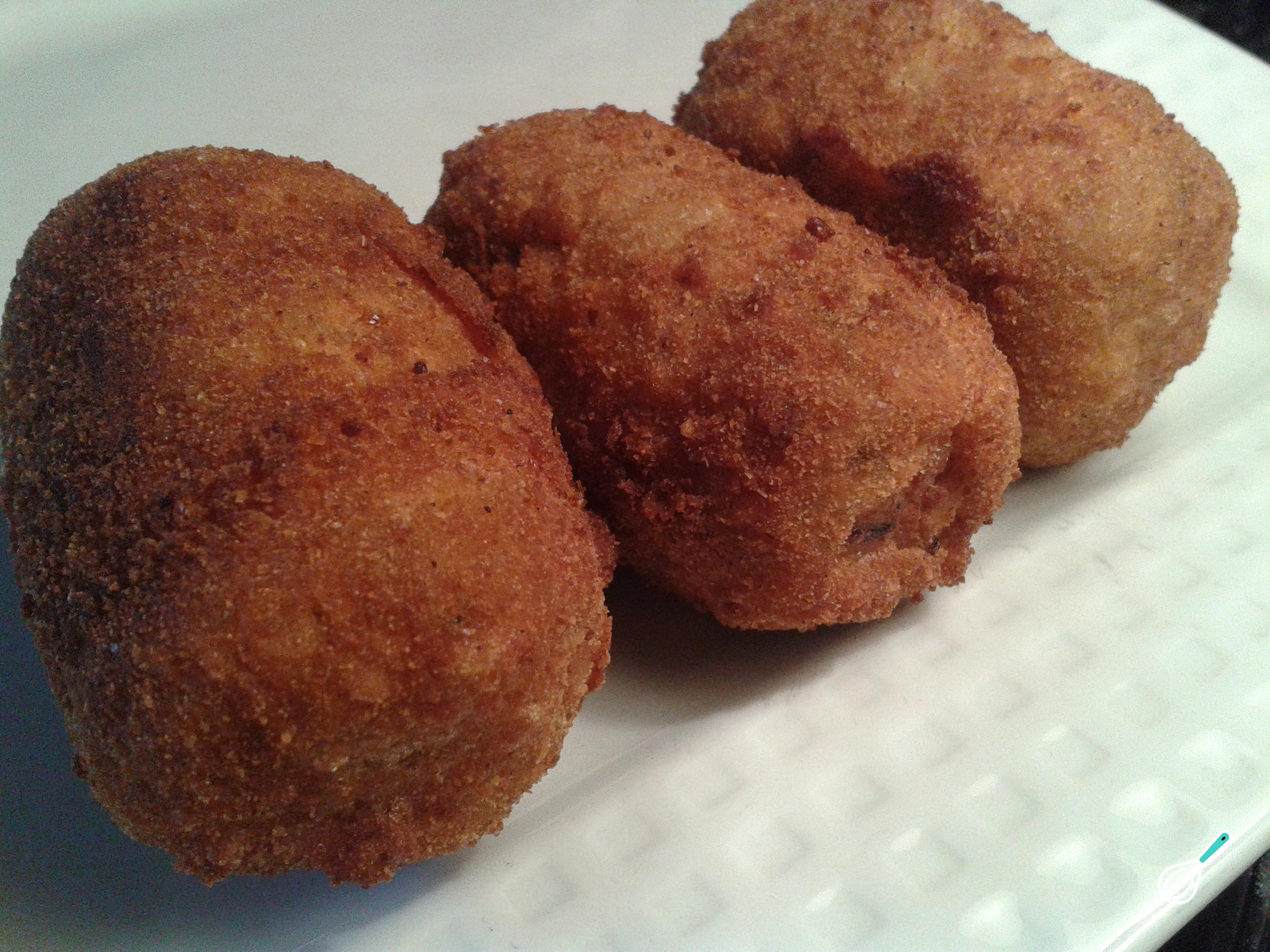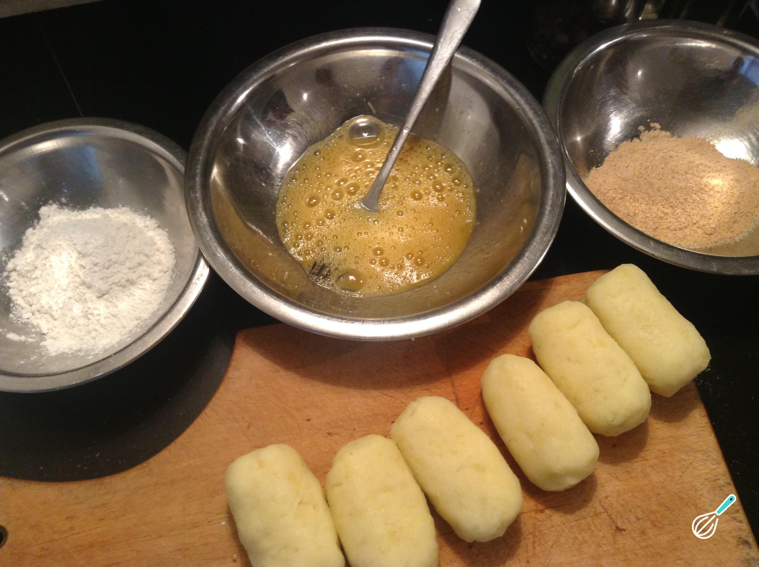 Forme os bolinhos um por um até terminar a massa. De seguida, passe os bolinhos primeiro por farinha, depois por ovo batido e, finalmente, pela farinha de rosca. Enquanto isso, aqueça o óleo lentamente a uma temperatura perto de 160 ° C.