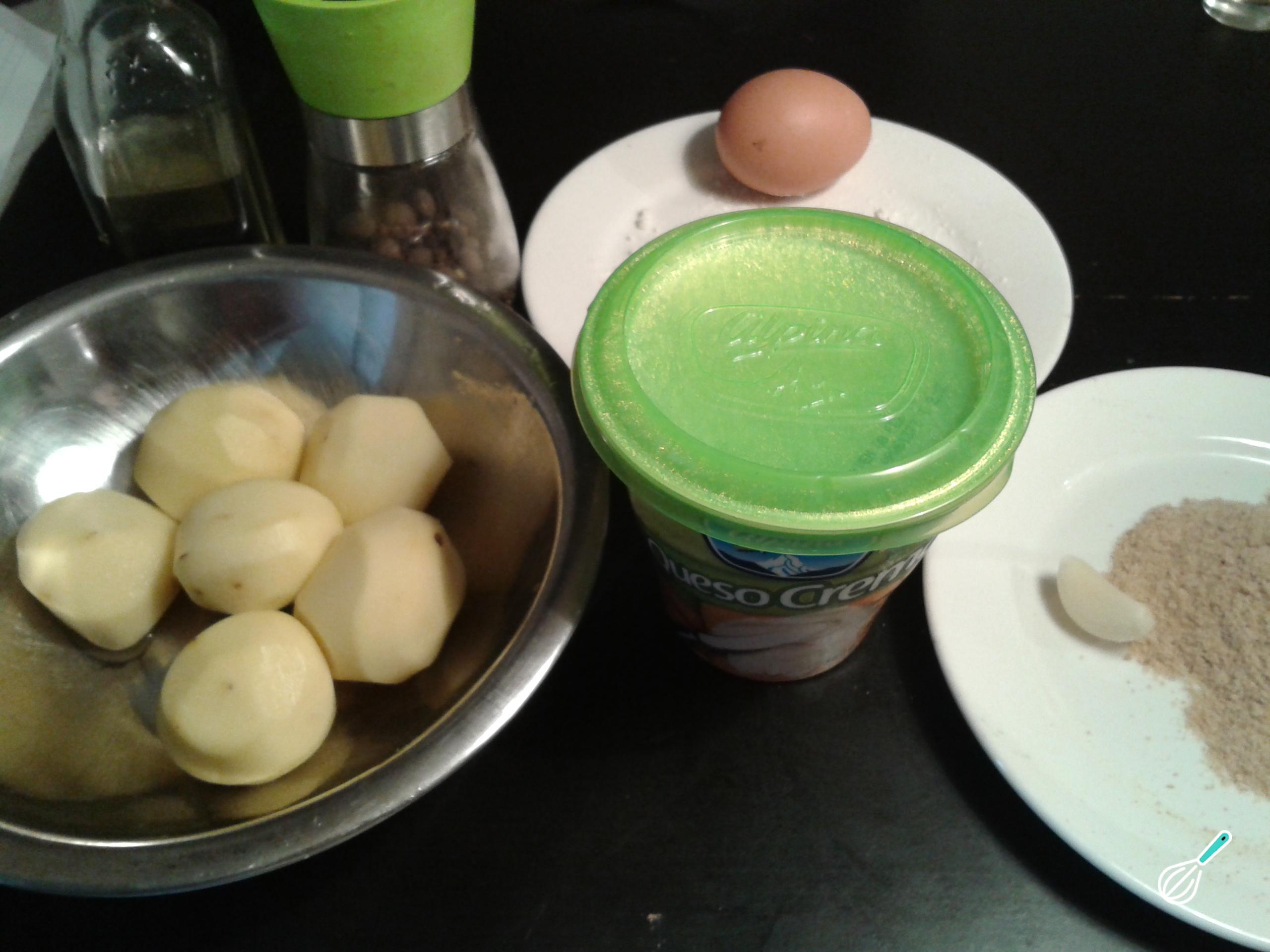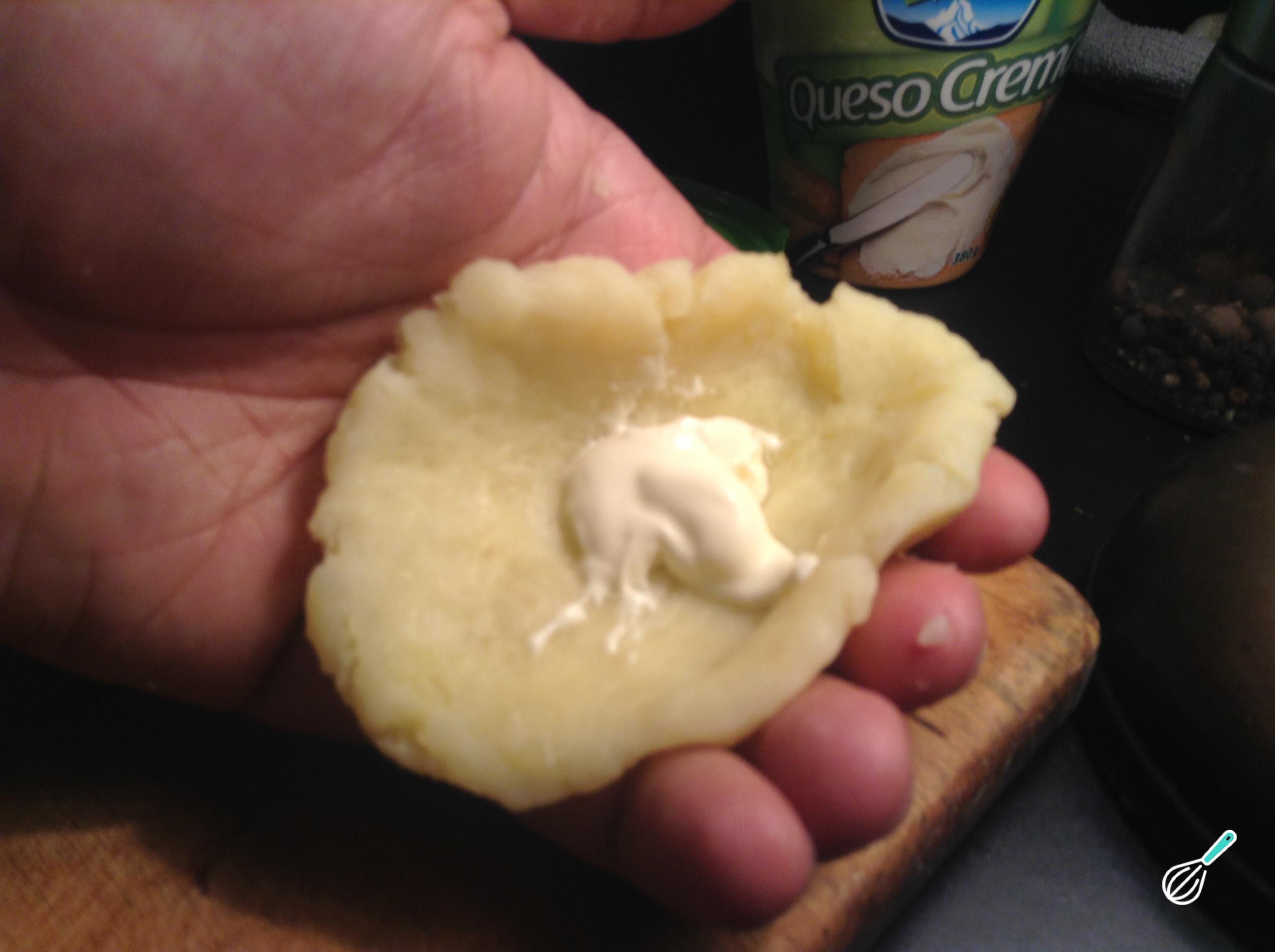 Deixe esfriar um pouco e quando o purê de batatas tiver uma temperatura que permita manuseá-lo sem problemas, modele pequenas tortilhas ou arepas e, no centro, coloque uma pequena porção de queijo creme, como visto na foto.
