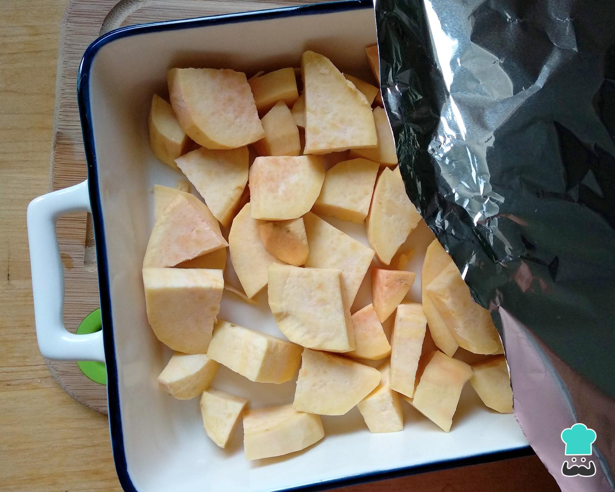 Comece por descascar a batata doce, cortar em rodelas e depois em pedaços. Coloque numa assadeira, cubra com papel alumínio e asse a batata no forno a 200ºC por 20 minutos ou até que esteja macia.