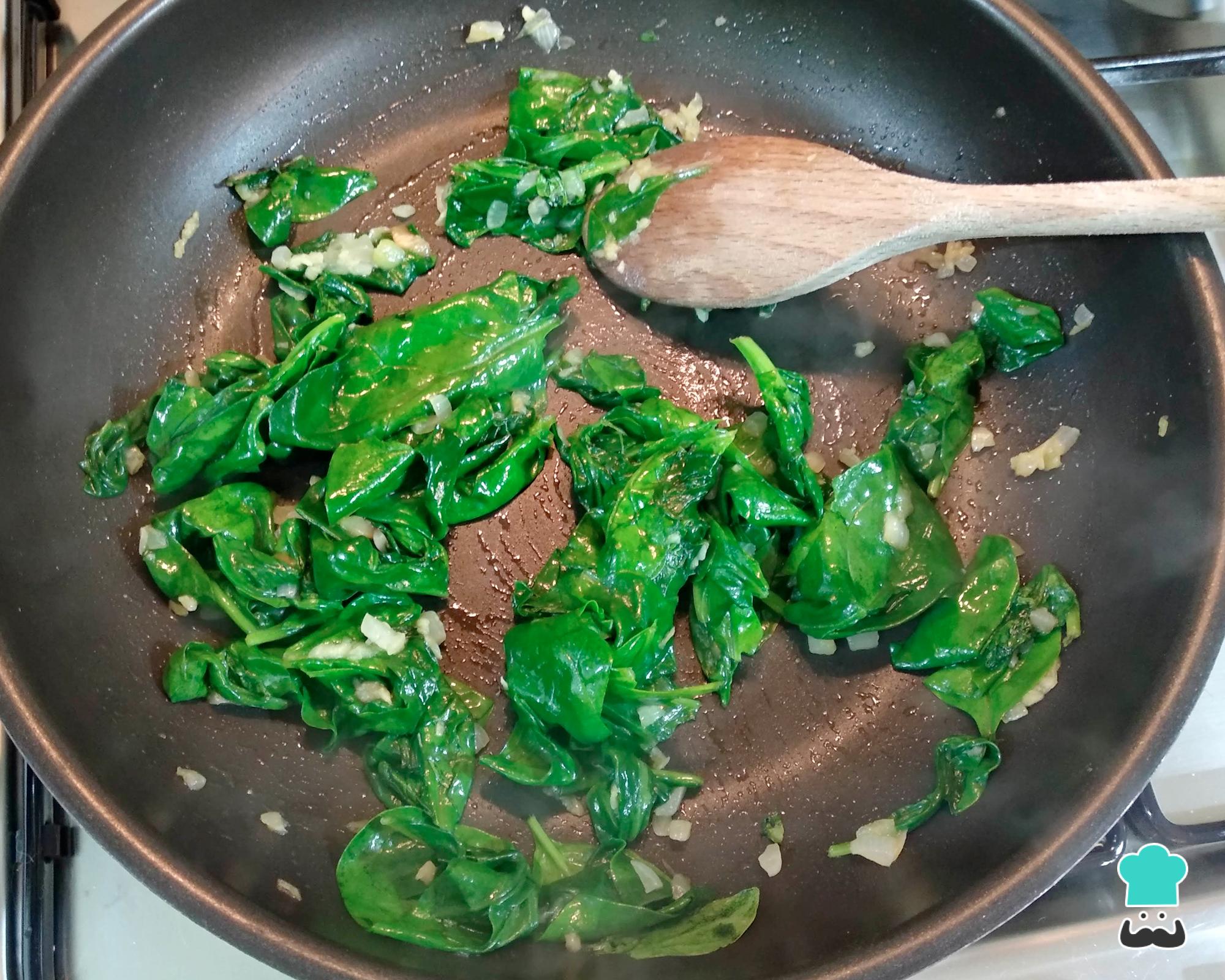 Enquanto isso refogue a cebola e os alhos no azeite até ficarem macios. Junte o espinafre e cozinhe até murchar, como na imagem. Tempere com sal e pimenta a gosto, desligue e reserve.