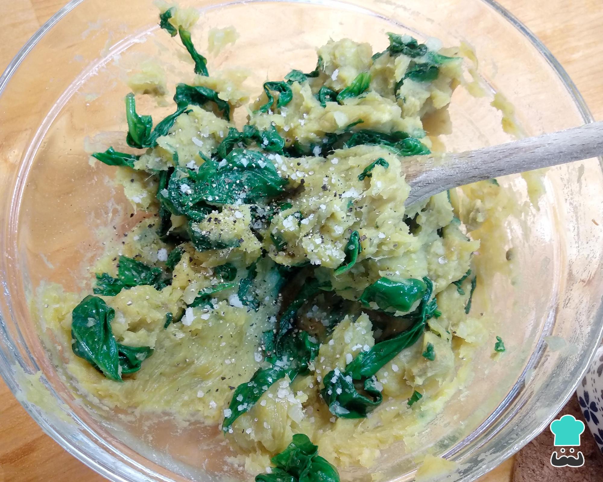 Quando a batata estiver macia, coloque em um bowl e esmague com um garfo até obter um purê. Adicione o refogado de espinafre, acrescente um pouco de sal e pimenta e misture tudo. Complete com queijo parmesão a gosto e farinha de rosca até dar liga - o purê deste bolinho de batata doce deve ficar consistente o suficiente para moldar na mão.