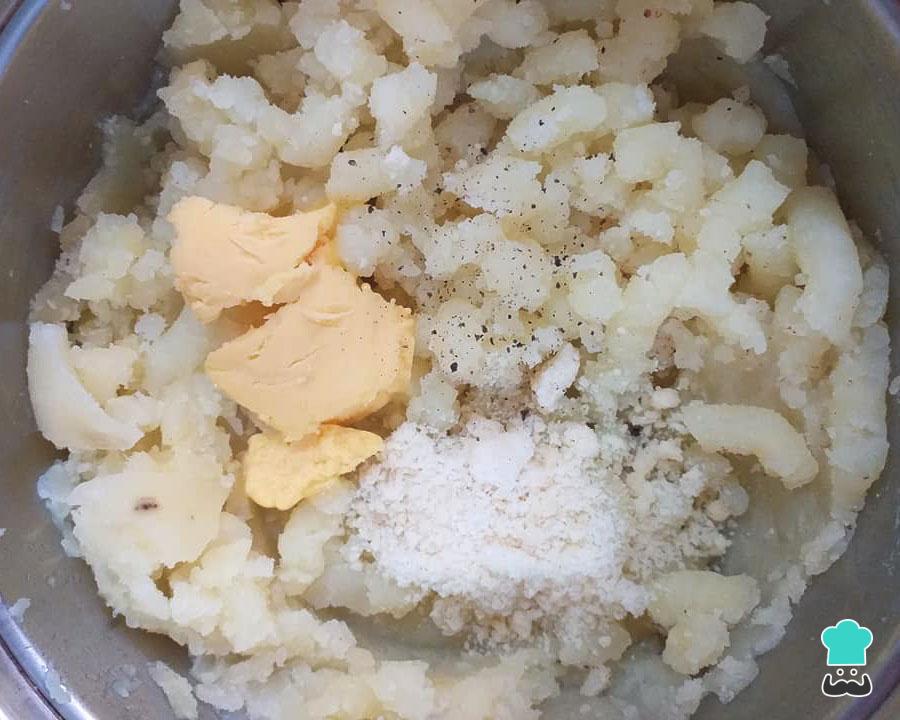 Escorra todo o líquido e amasse as batatas ainda quentes. Adicione o queijo parmesão ralado, a manteiga, a salsa picada, a noz moscada e pimenta do reino. Misture tudo até ficar homogêneo.