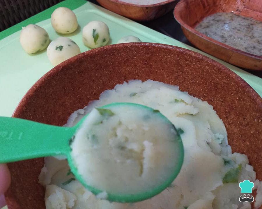 Deixe a massa esfriar para ser utilizada. Com uma colher de medida, para que fiquem do mesmo tamanho, pegue porções da massa.