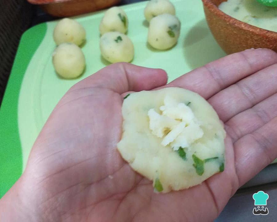 Para rechear o bolinho abra a porção na palma da mão (sem deixar a massa muito fina), acrescente cubinhos do queijo desejado e feche as bolinhas com cuidado, cobrindo todo o recheio.