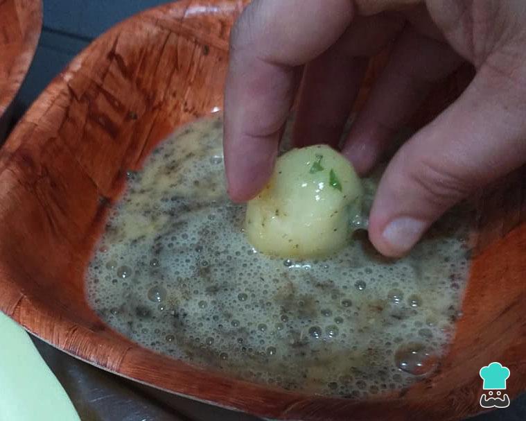 Empane os bolinhos passando-os no ovo batido e depois na farinha de rosca.