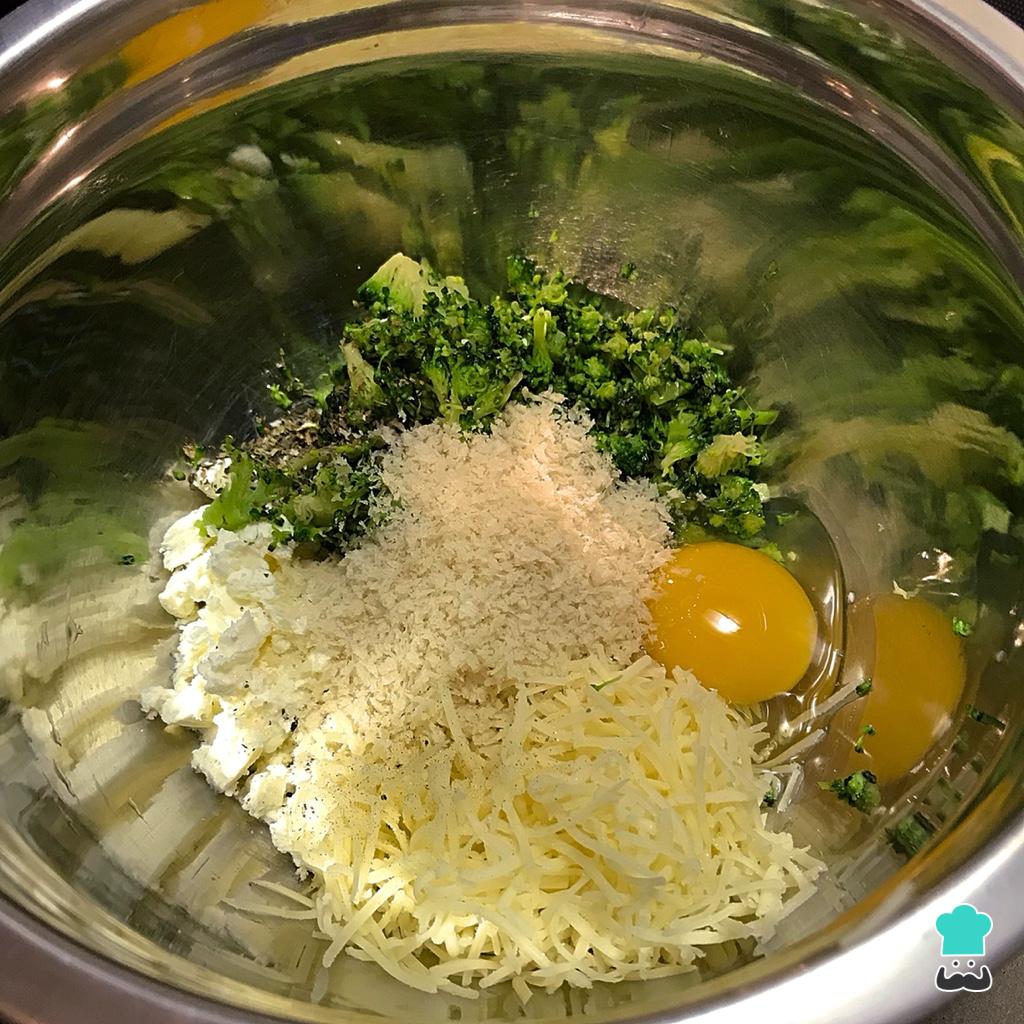 Comece misturando todos os ingredientes em um bowl - esta receita de bolinho de brócolis com queijo é fácil mesmo!