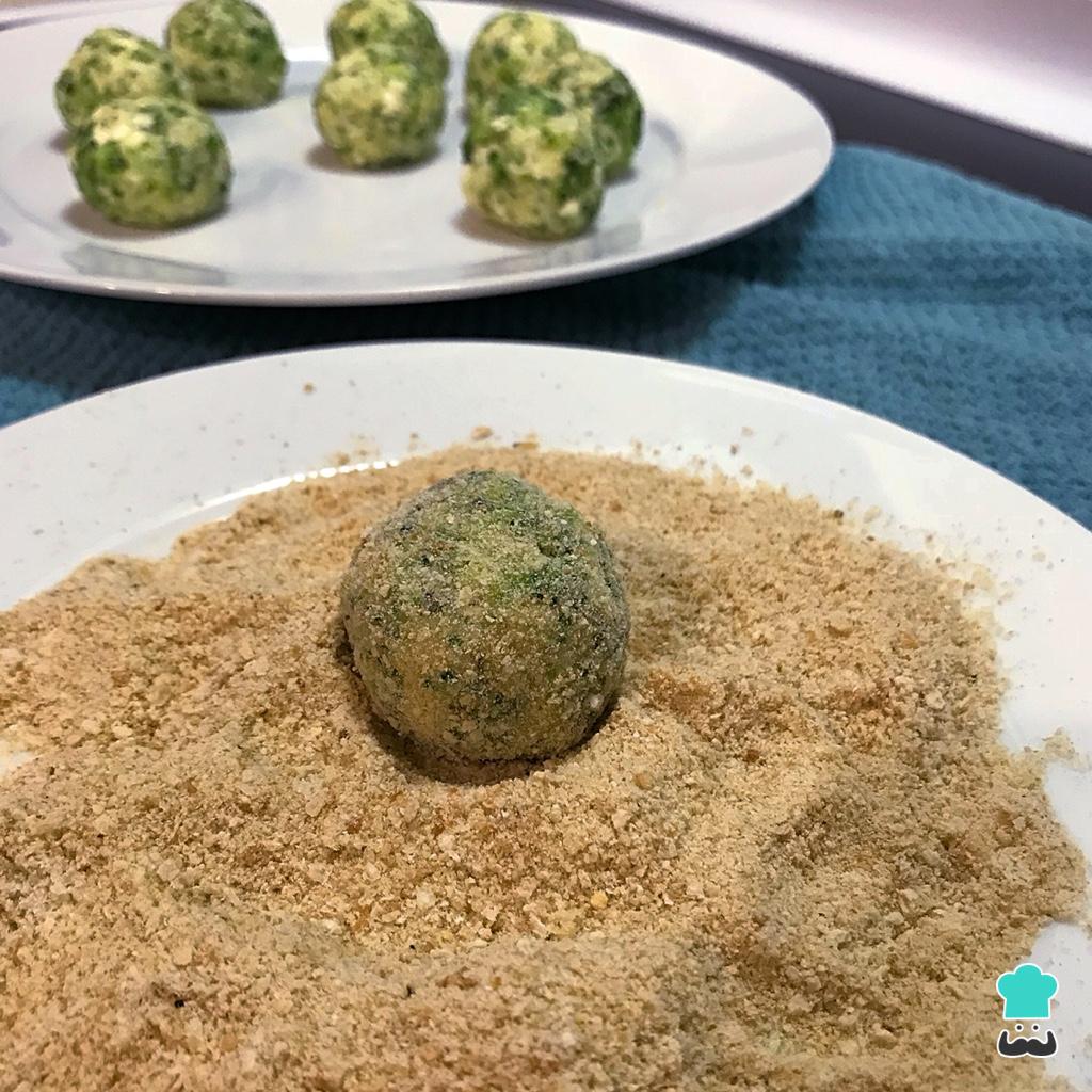 O passo seguinte desta receita de bolinho de brócolis com queijo é passar as bolinhas na farinha de rosca.