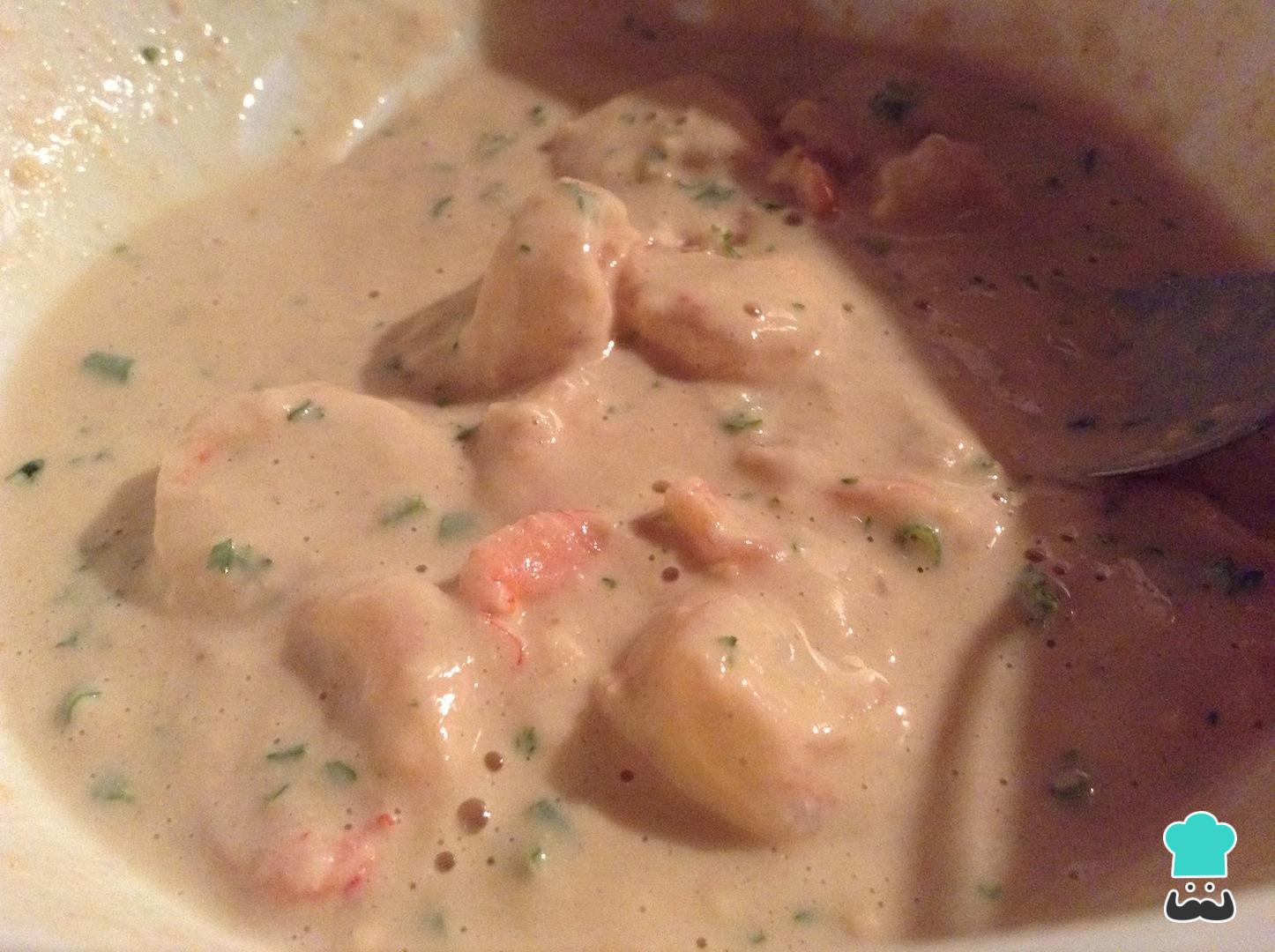Finalmente adicione a água a este preparado de bolinho salgado de camarão e misture bem, de forma a obter um creme espesso. Retifique o sabor com sal e pimenta.