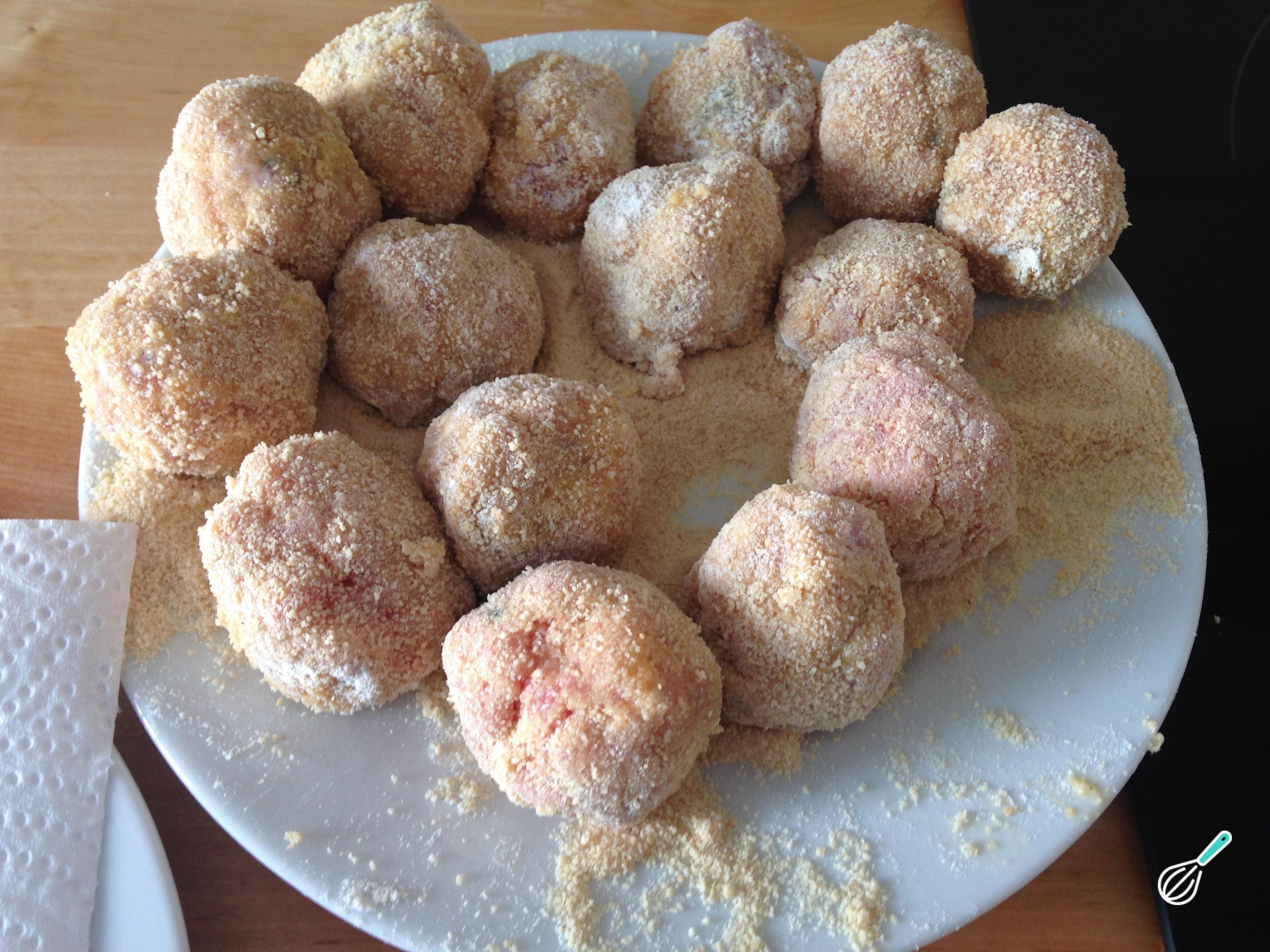 Modele os bolinhos de carne moída em formato de bola ou em formato de cilindro. Passe cada um na farinha de rosca, no ovo batido e na farinha.