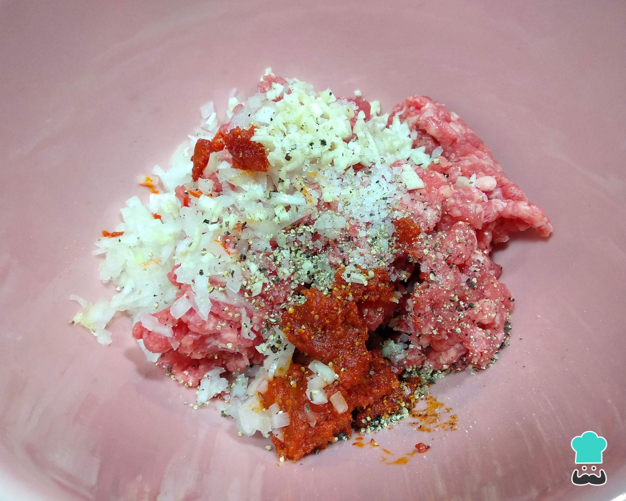 Num bowl coloque a carne moída, a massa de pimentão, a cebola, o alho, a pimenta do reino e o sal a gosto. Misture muito bem com as mãos para distribuir os temperos por toda a carne.