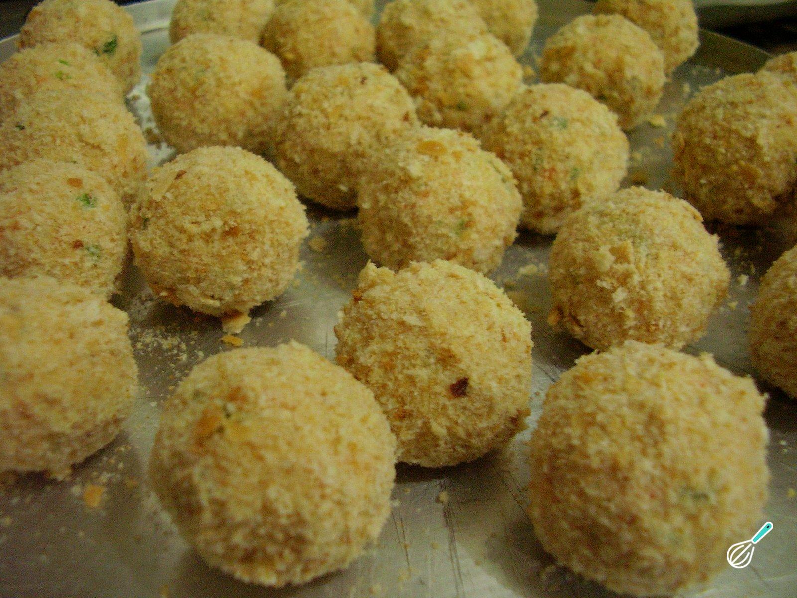 Tempere a massa com sal e pimenta do reino a gosto e modele bolinhas com as palmas das mãos. Passe cada bolinho de cenoura primeiro pelo ovo e, em seguida, pela farinha de rosca.