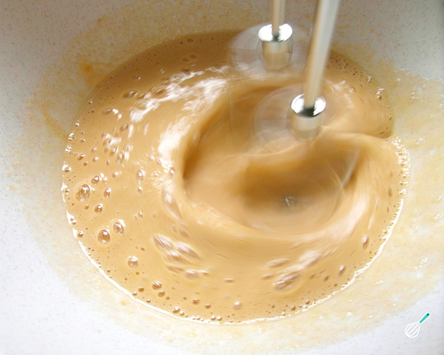 Para fazer esta receita de bolinho de chuva assado comece por colocar em uma tigela o açúcar, a manteiga e os ovos. Bata com uma batedeira até espumar, adicione o leite morno e volte a bater.