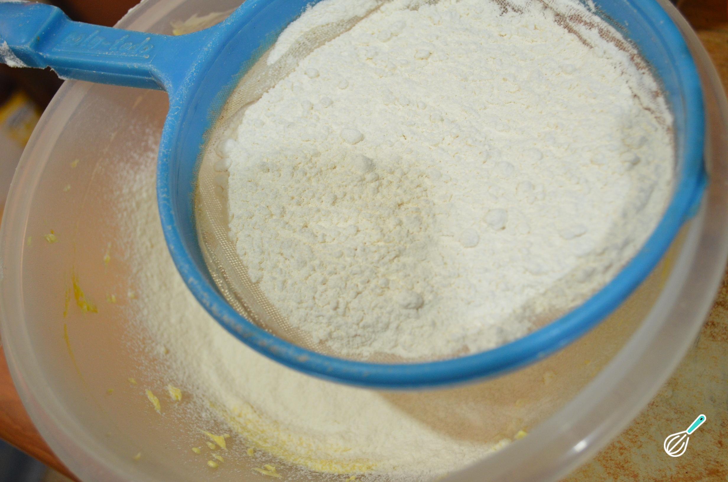 Em seguida adicione a farinha peneirada e o fermento junto. Misture com a ajuda de uma colher ou de uma espátula até obter uma massa semelhante a massa de bolo.