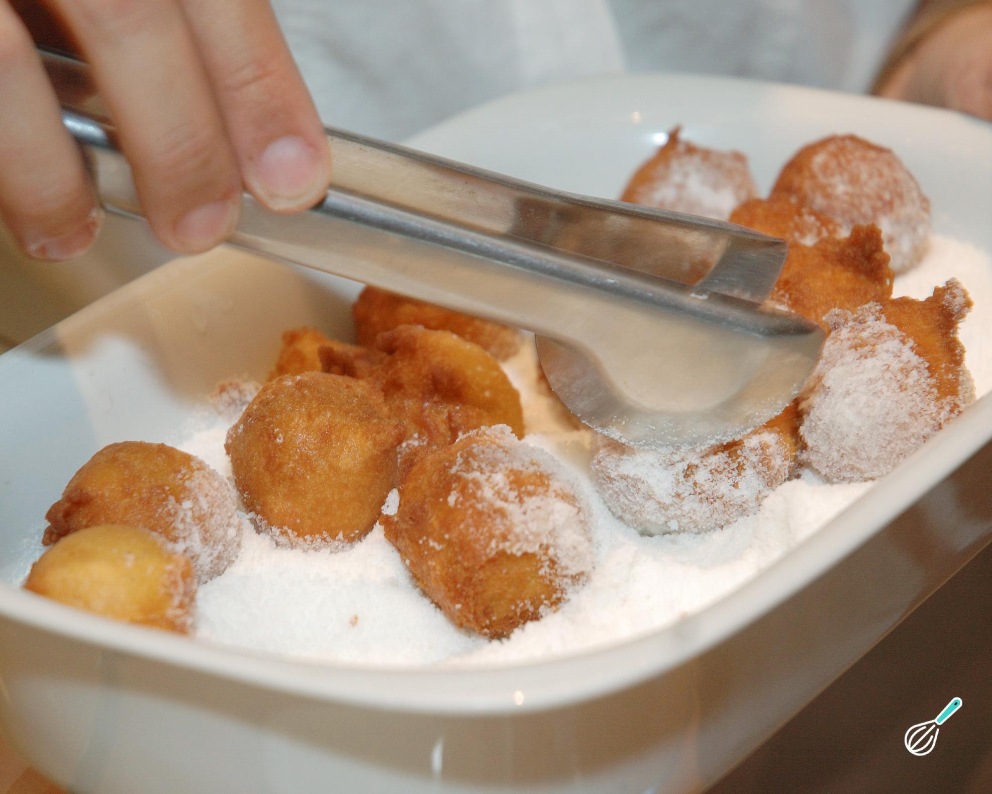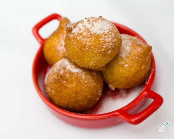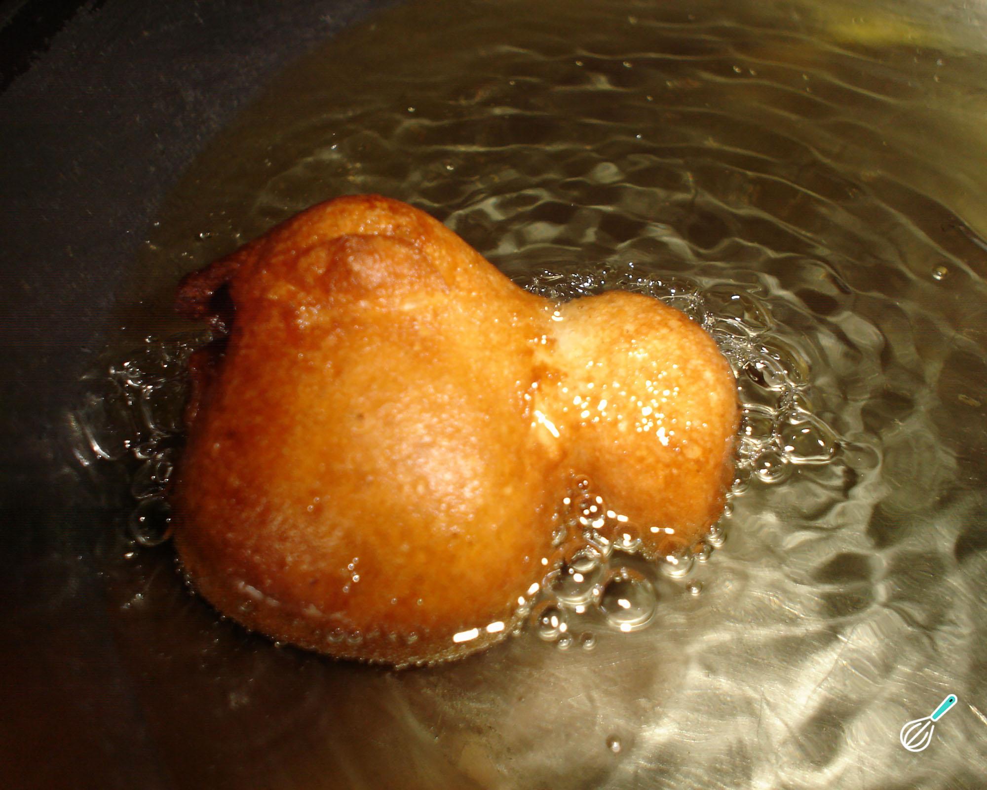 Dica: frite poucos bolinhos de cada vez (3 ou 4), para não baixar a temperatura do óleo e conseguir que fiquem sequinhos.