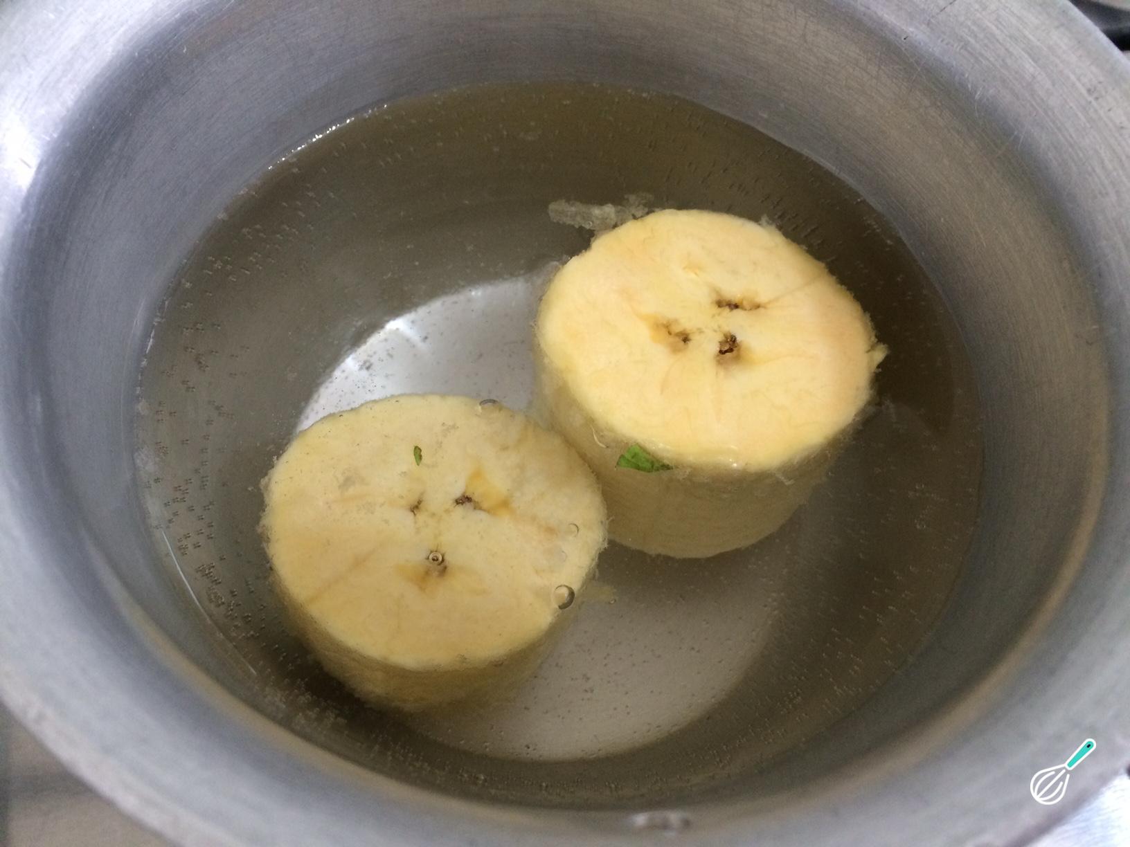 Em uma panela com água fervente, cozinhe a banana madura, previamente descascada. Deixe no fogo por 25 minutos até que esteja macia.