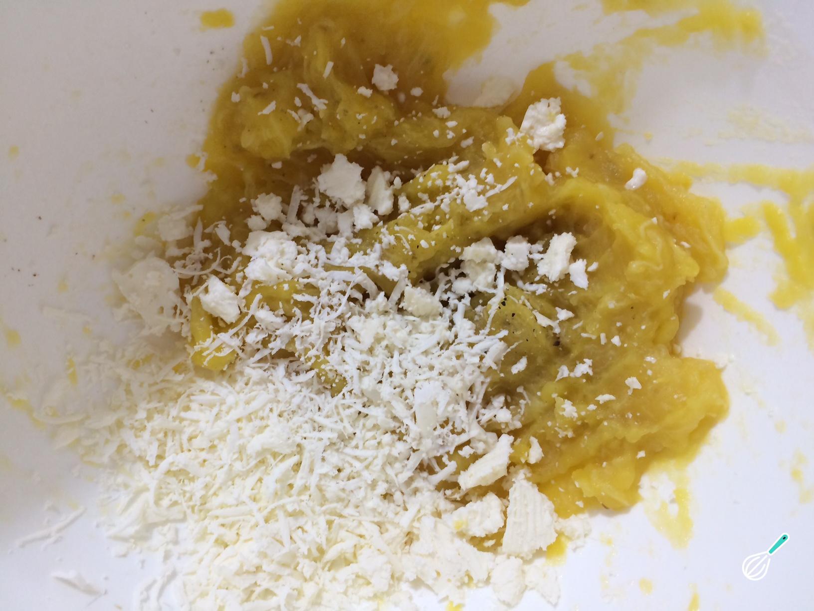 Quando estiver pronta, retire da água e amasse até obter um purê. Em seguida, adicione o queijo fresco ralado, uma pitada de sal e pimenta do reino, e misture tudo muito bem.