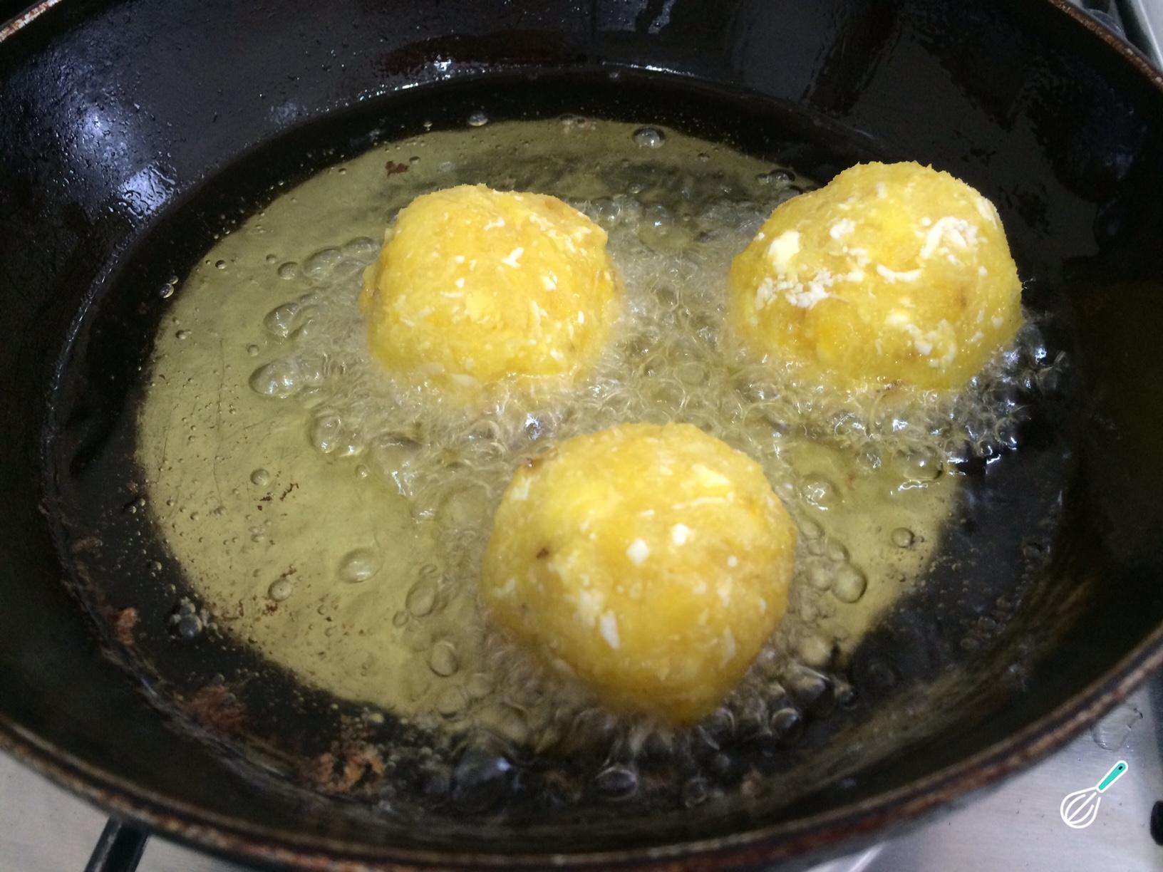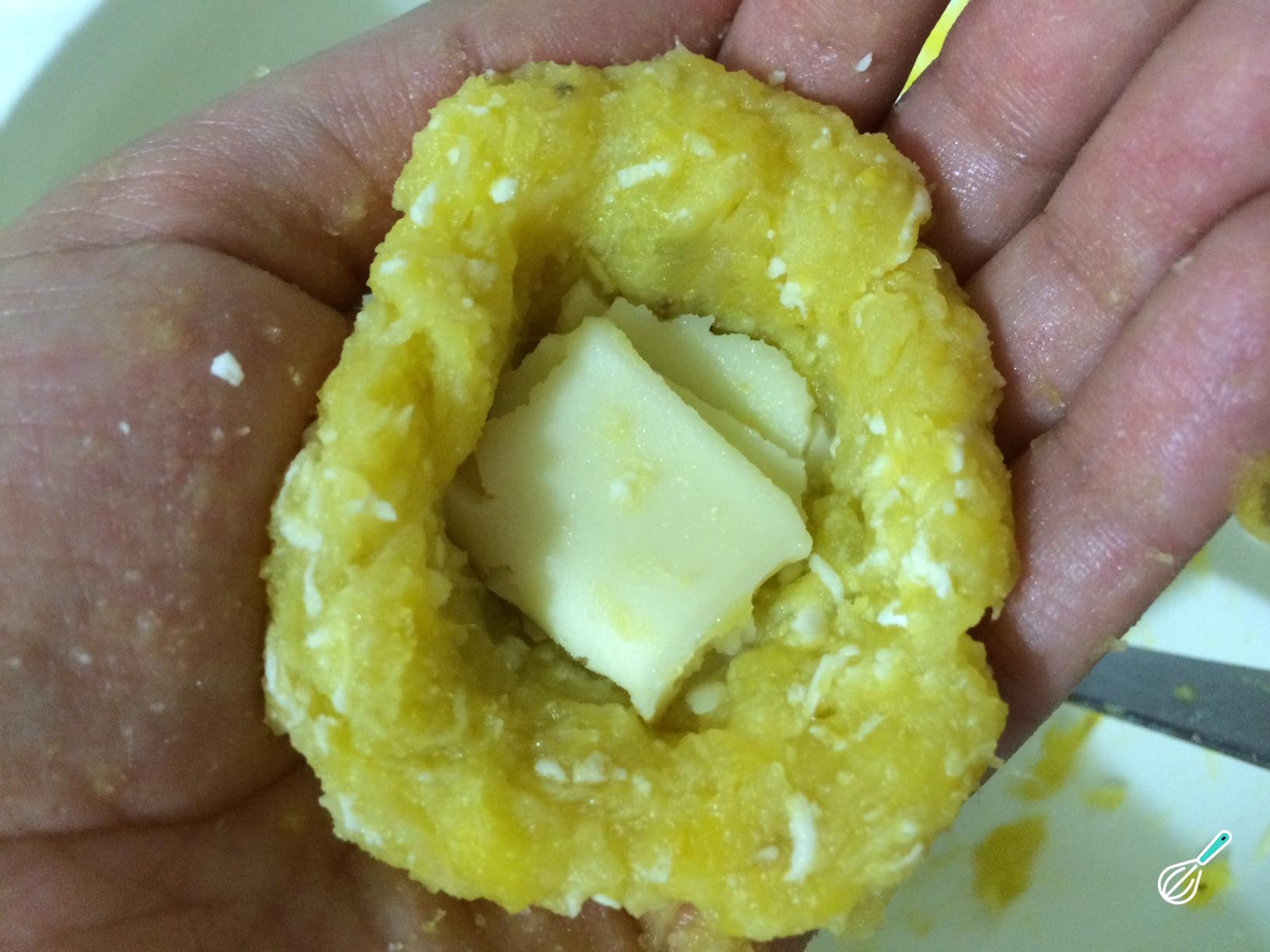 Para modelar os bolinhos de chuva, fazer um bolinha de purê de banana com as mãos. Em seguida, esmague-a e adicione um pouco de queijo mussarela no centro. Feche muito bem para voltar para formar uma bola com a massa.