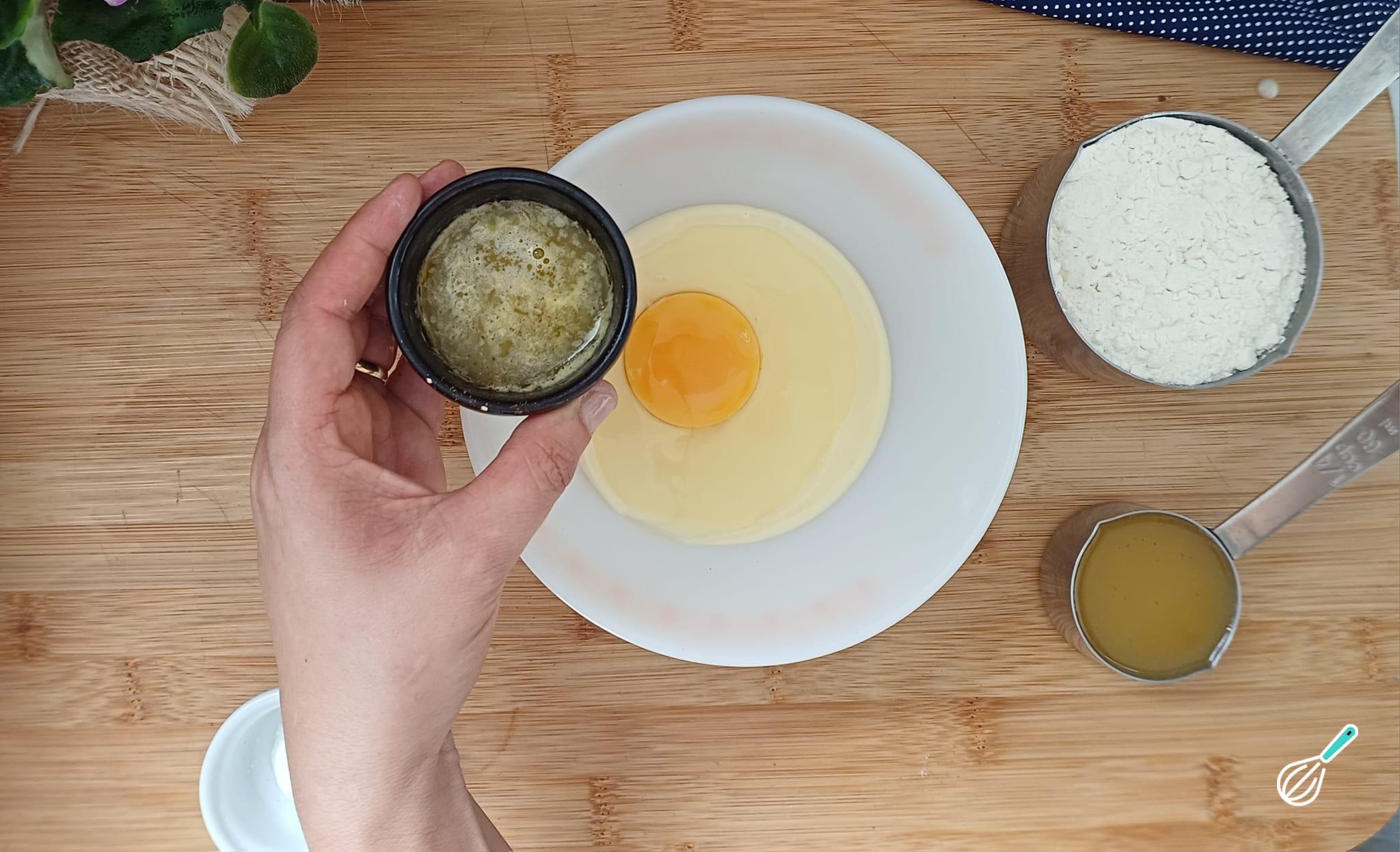 Num bowl, coloque o leite condensado, o ovo e a manteiga derretida.