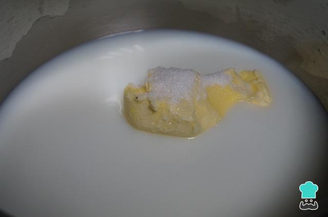 Leve ao fogo uma panela com o leite, a água, a manteiga e o anis. Deixe no fogo até começar a ferver.