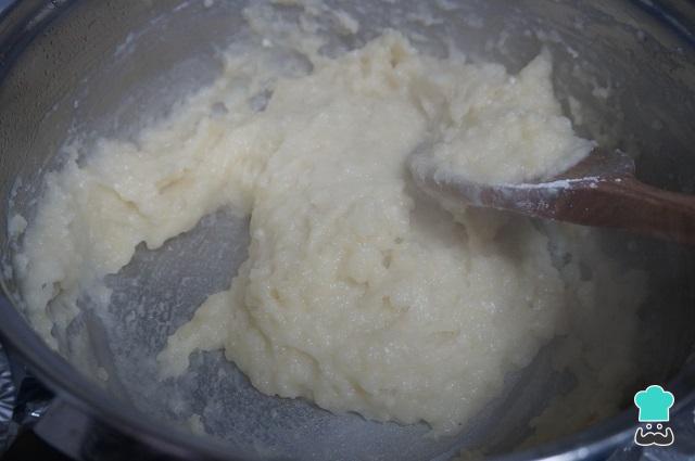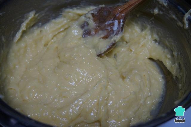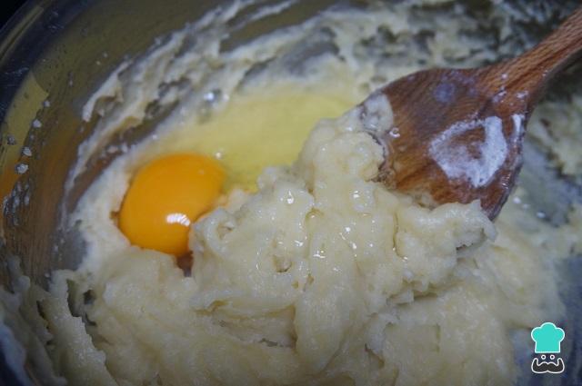 Dica: Neste momento a massa estará um pouco dura. Porém, à medida que você mistura os ovos nela, ela ficará mais macia.
