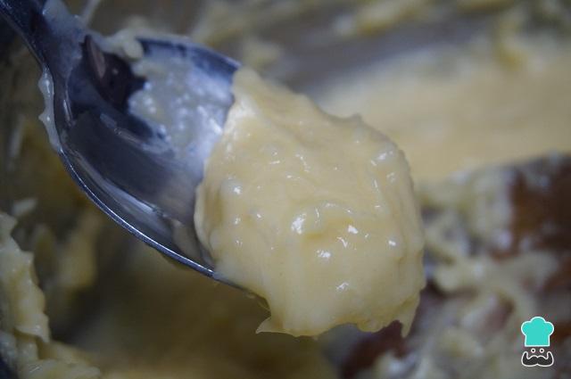 Deixe a massa esfriar por 10 minutos. Depois adicione os ovos um a um, mexendo bem para incorporar na massa de bolinho de chuva tradicional.