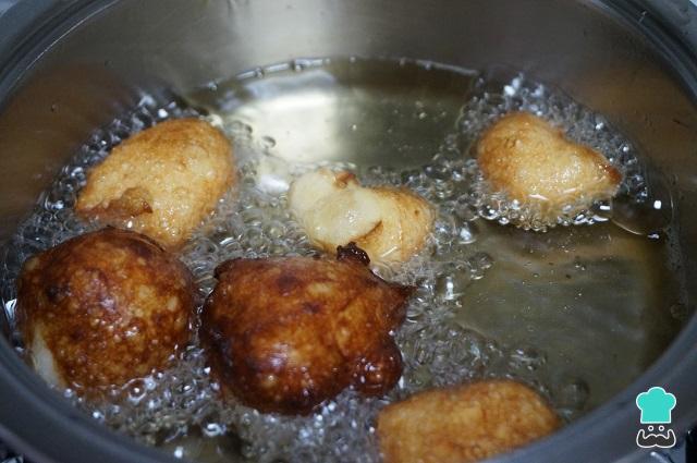 Esquente o óleo numa panela. Quando estiver quente retire porções de massa com uma colher e modele com a ajuda de uma segunda colher, conferindo um formato redondo. Coloque fritando 4 a 5 bolinhos de chuva de cada vez.