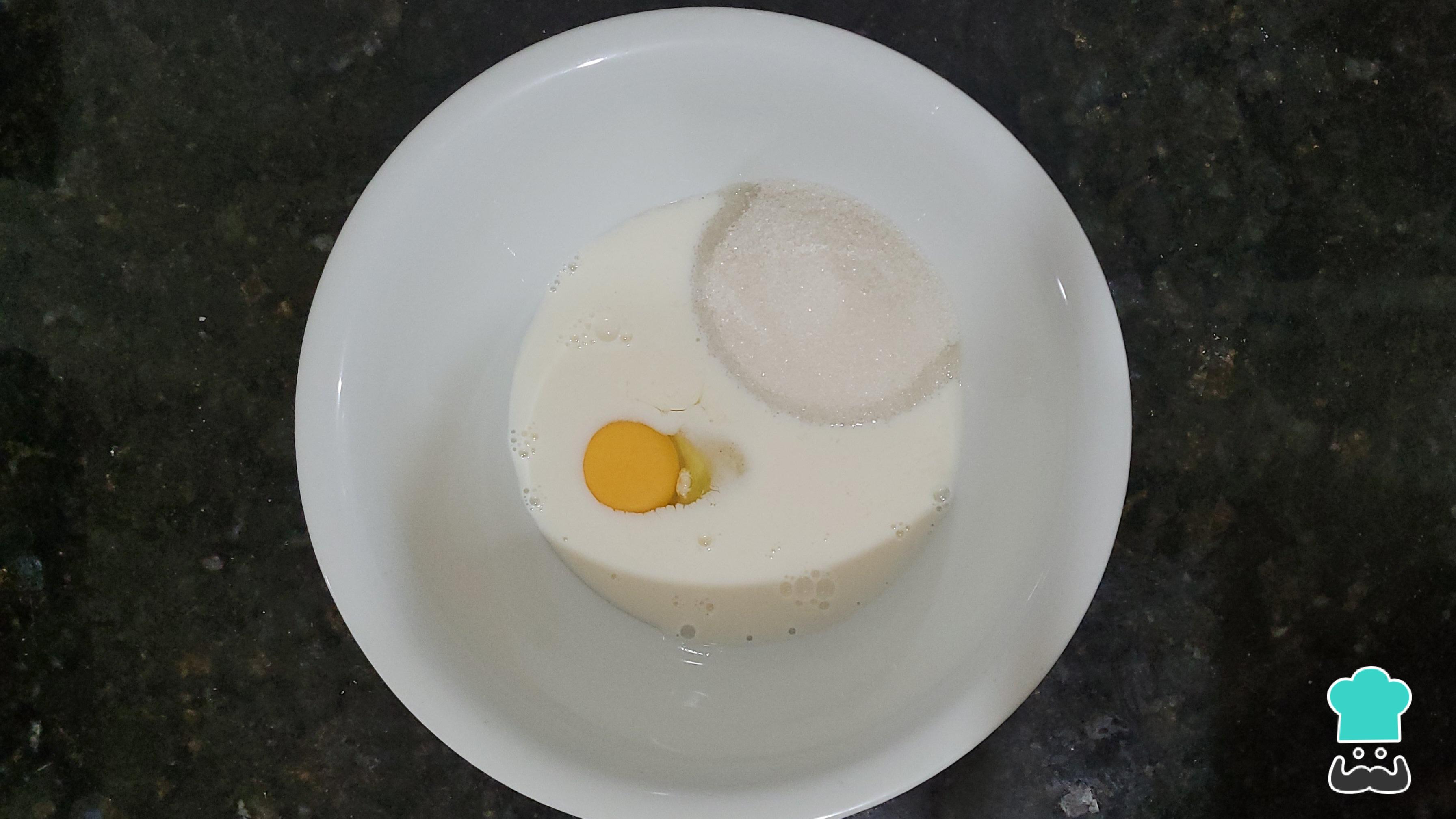 Em uma tigela, coloque o ovo, o leite, o açúcar. Mexa bem.