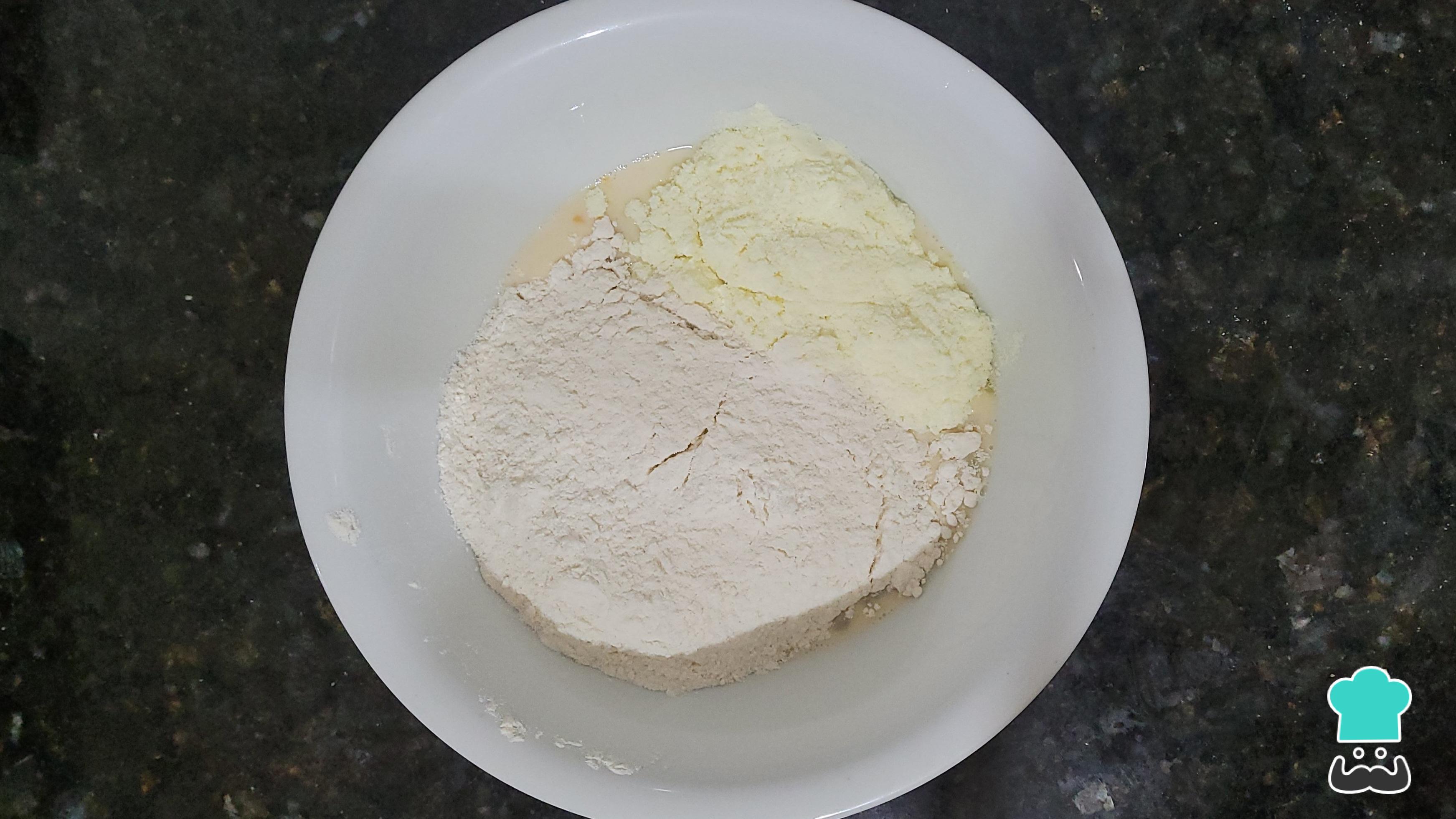 Acrescente a farinha de trigo e o leite em pó. Misture para homogeneizar.