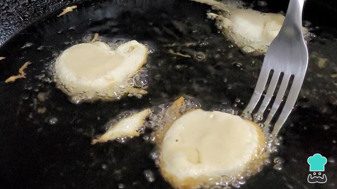 Dica: Antes de colocar, faça o teste com um pouquinho da massa. Coloque e veja se ela bóia, começando a fritar. Caso ela afunde ou demore muito para aparecerem bolhinhas, o óleo ainda está frio e é necessário esperar mais um pouco