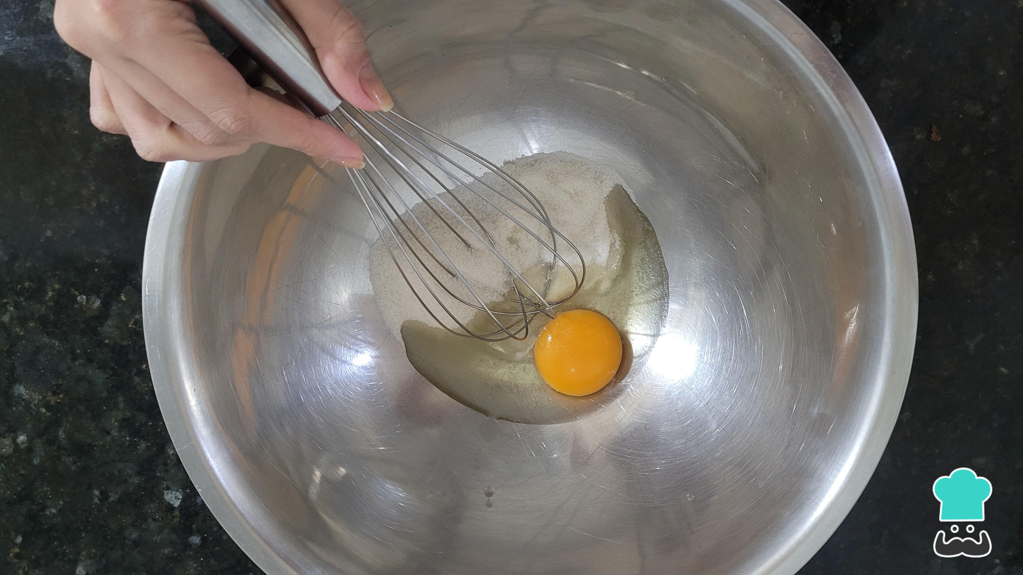 Em um recipiente, coloque o açúcar, o ovo e bata com um fouet para que fique uma espuma de cor clara.
