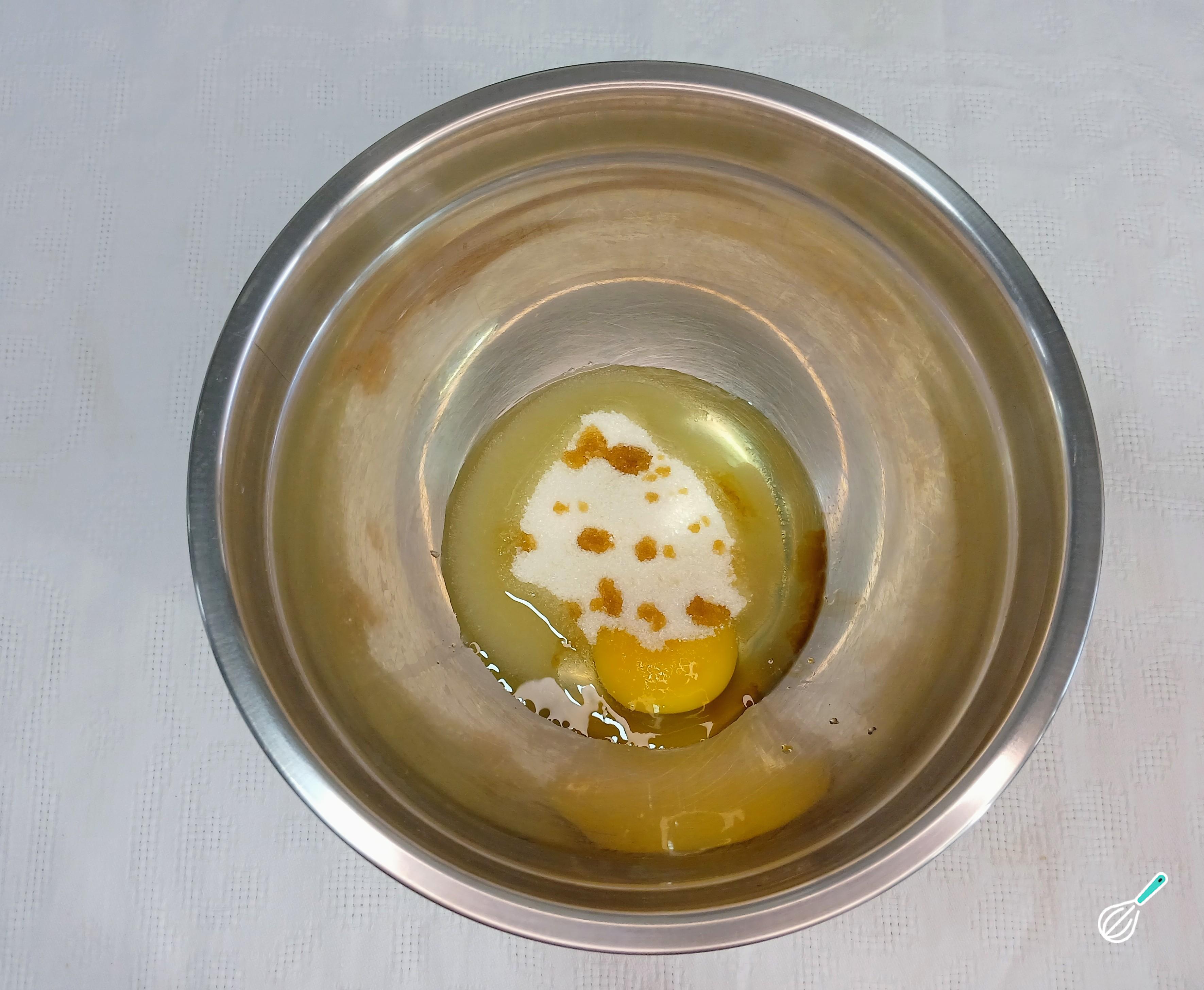 Em um bowl coloque o ovo, o açúcar e a essência de baunilha. Misture tudo muito bem para incorporar brm os ingredientes.
