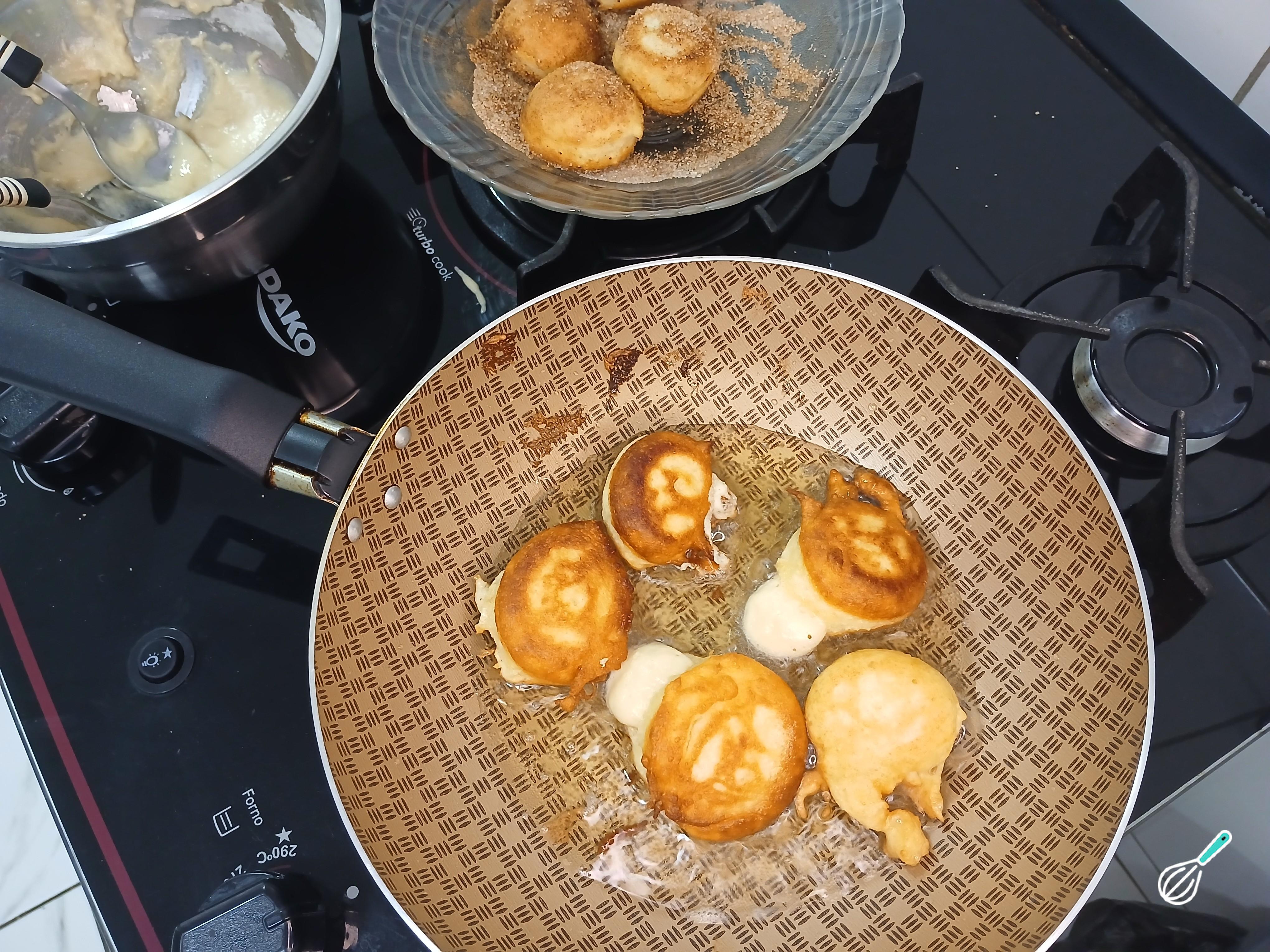 Adicione um pouco de óleo e coloque os bolinhos para fritar. Use uma colher e vá colocando na frigideira. Com o fogo baixo e sempre virando para fritarem por dentro.