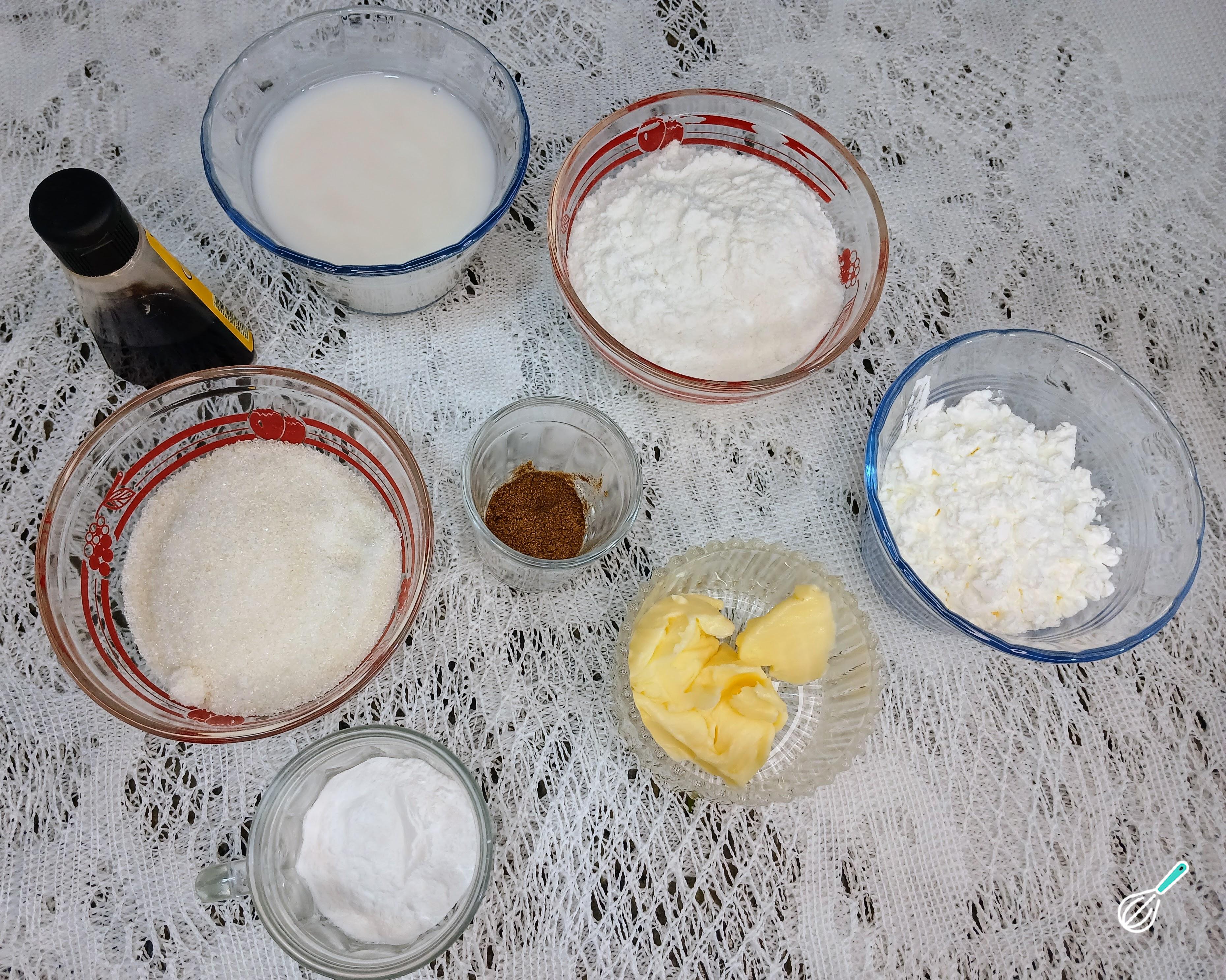 Comece separando os ingredientes para o preparo do bolinho de chuva sem ovo e sem leite. Separe a farinha receita arroz e o amido de milho e deixe medido. Separe o leite vegetal (para essa receita é necessário que seja leite vegetal ou água). Separe a essência de baunilha, a margarina e o açúcar. Separe canela em pó, fermento químico e óleo para fritar.