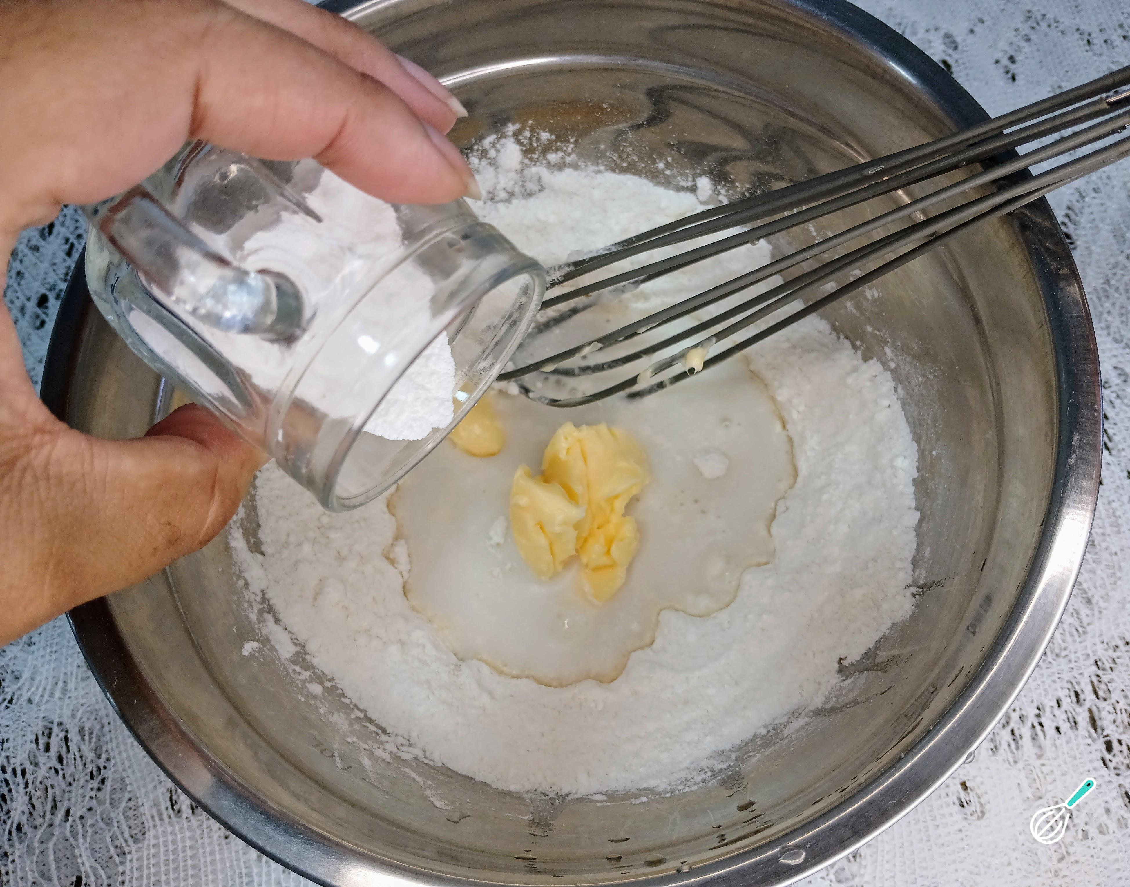 Em um bowl, adicione a farinha de arroz, o amido de milho e o açúcar. Adicione também as gotas de essência de baunilha e misture tudo muito bem com o auxílio de um fouet.