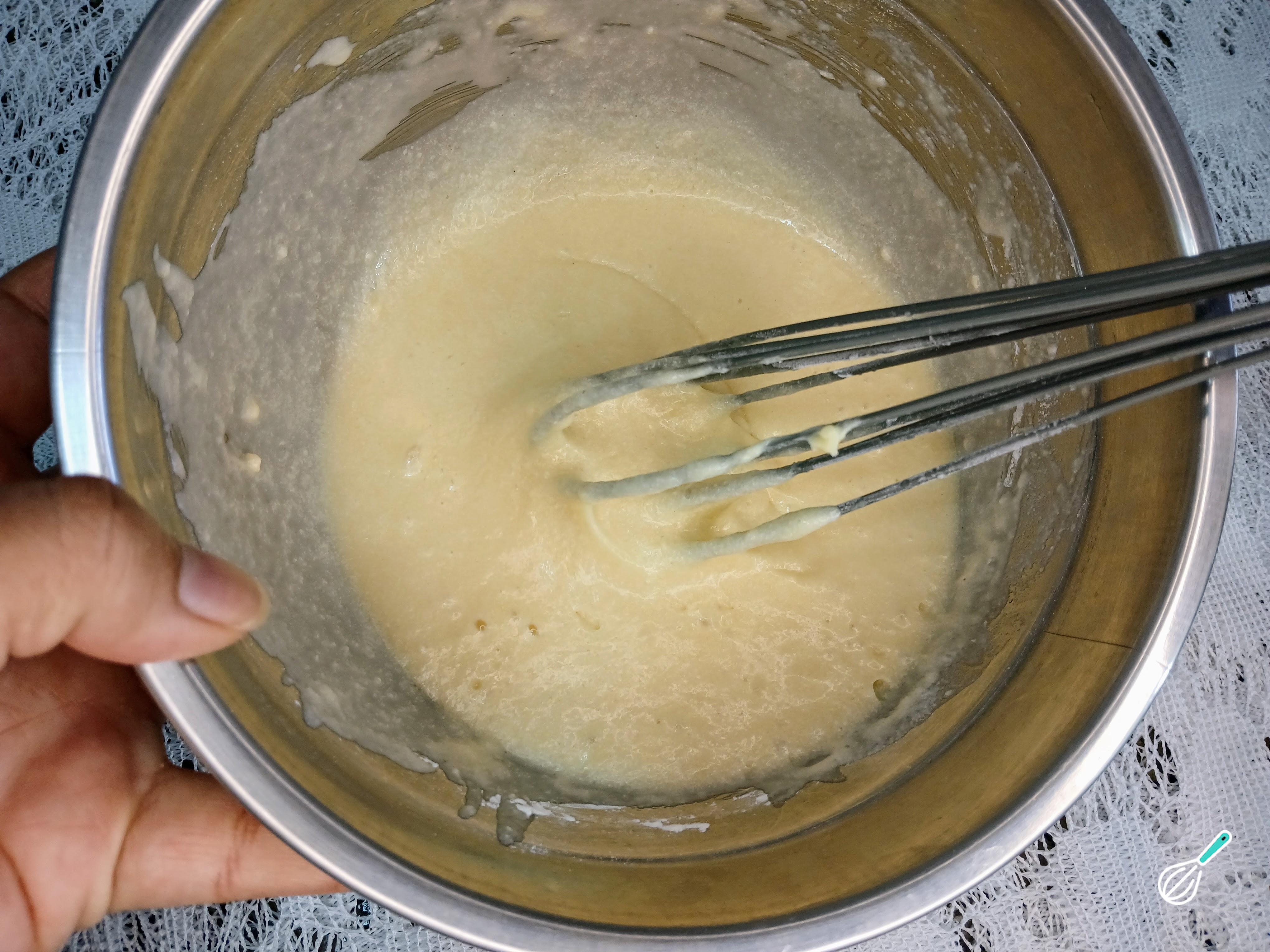 Misture a massa com o fouet até que fique bem homogênea e lisinha. A massa não deverá ficar muito líquida e nem muito espessa. Precisa estar de um jeito que fique em uma colher para ser colocada para fritar.
