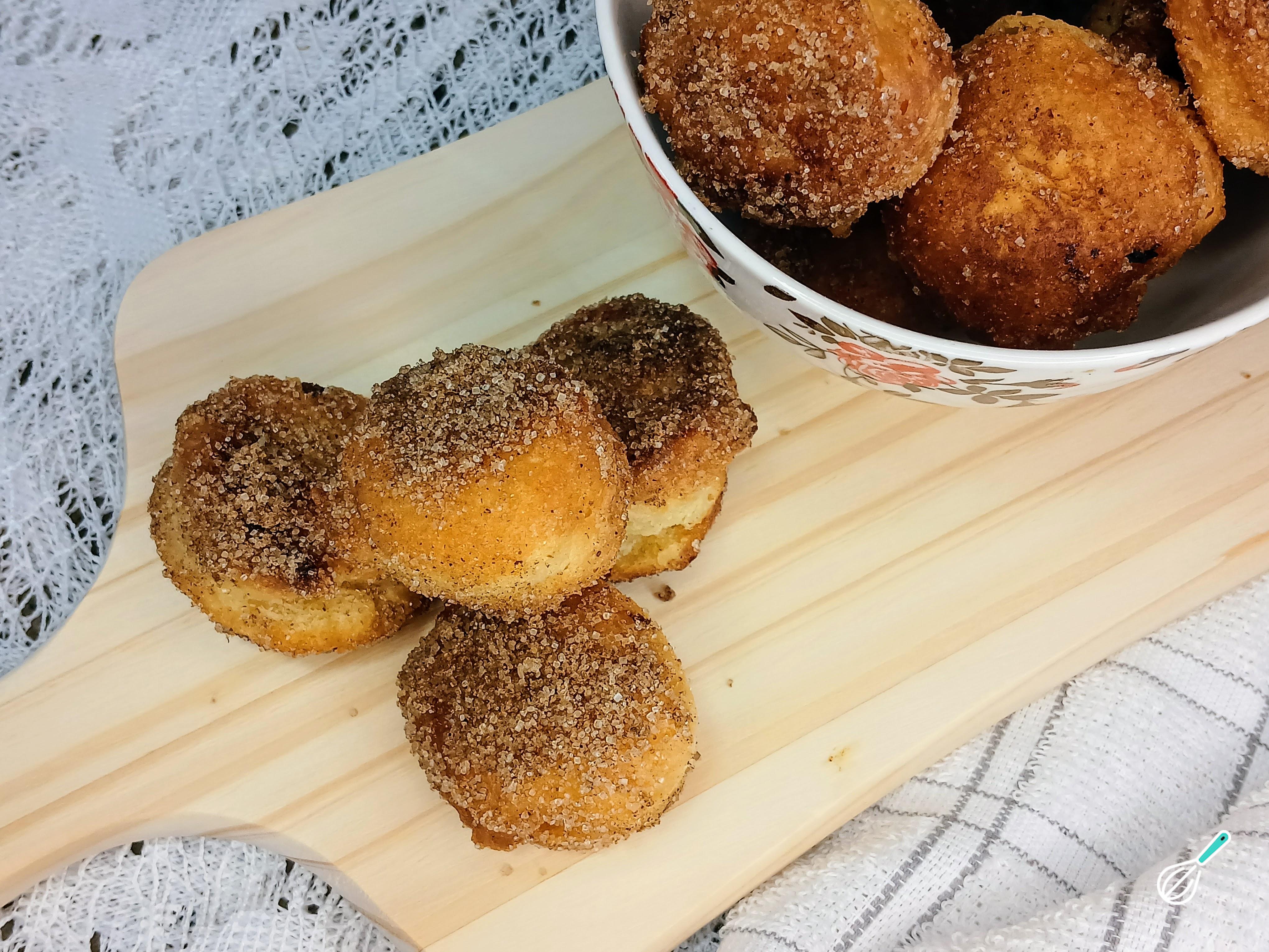 Coloque canela em pó e açúcar em um prato e assim que retirar os bolinhos da panela, coloque-os nessa mistura e mova-os para que fiquem cobertos com a canela e o açúcar.